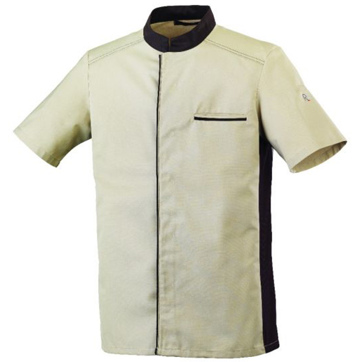 Veste de cuisine avec col officier de couleur Boutons pression cachés Surpiqûres contrastées : plastron + épaules + dos Liseré contrasté : plastron + poche poitrine Revers bas de manches contrastés Bande en maille respirante sur les côtés Poche stylo sur manche