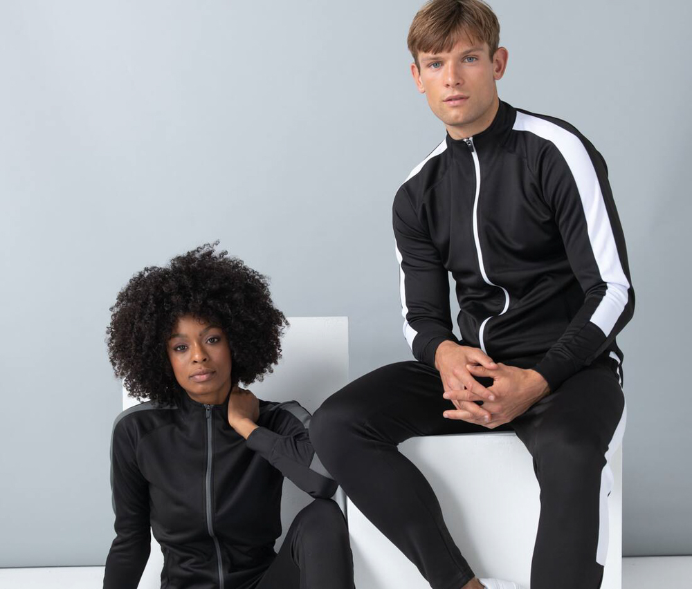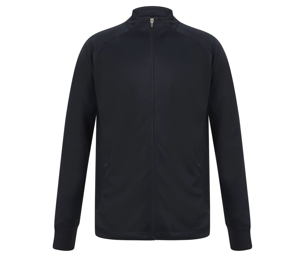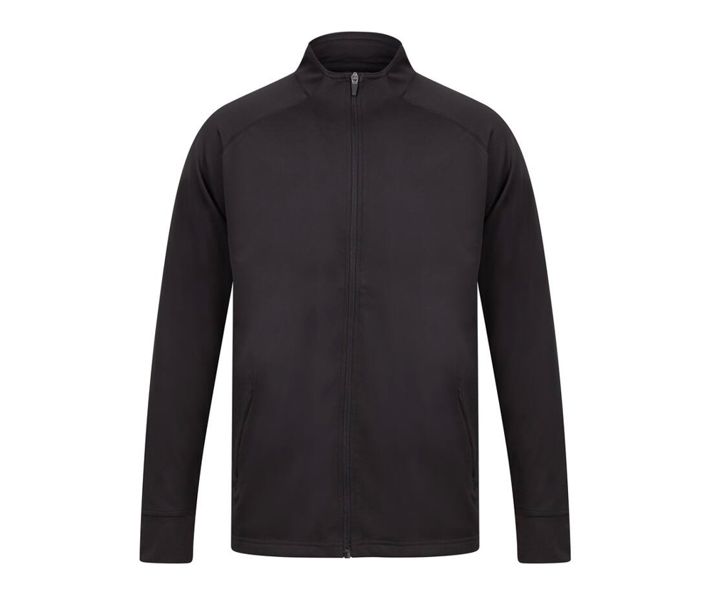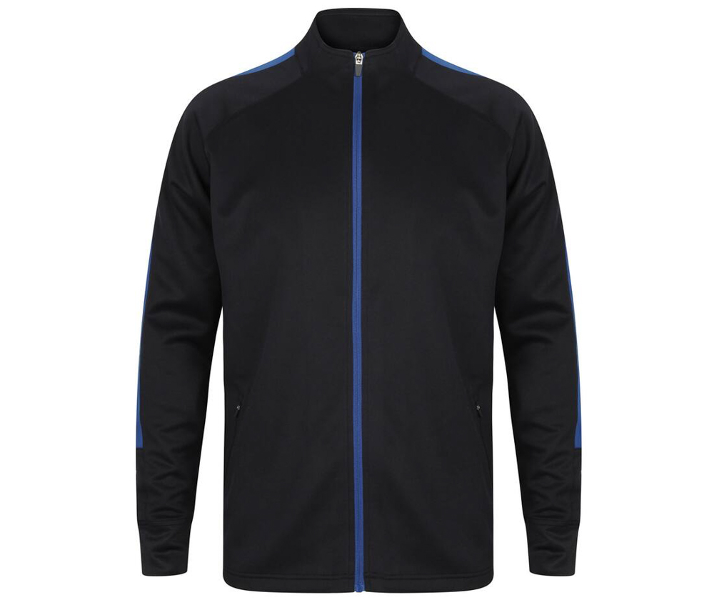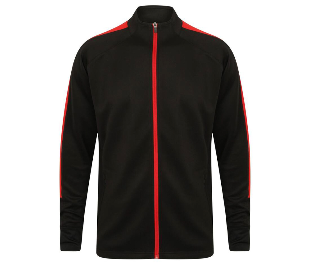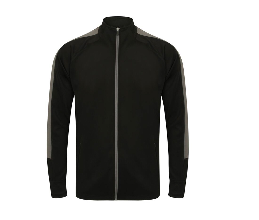 Veste de sport. Veste grand zip contrasté. Bandes contrastées épaules et manches. Poches latérales zippées. Poignets en bords côte 1×1. Col cheminée. 100% polyester Interlock.