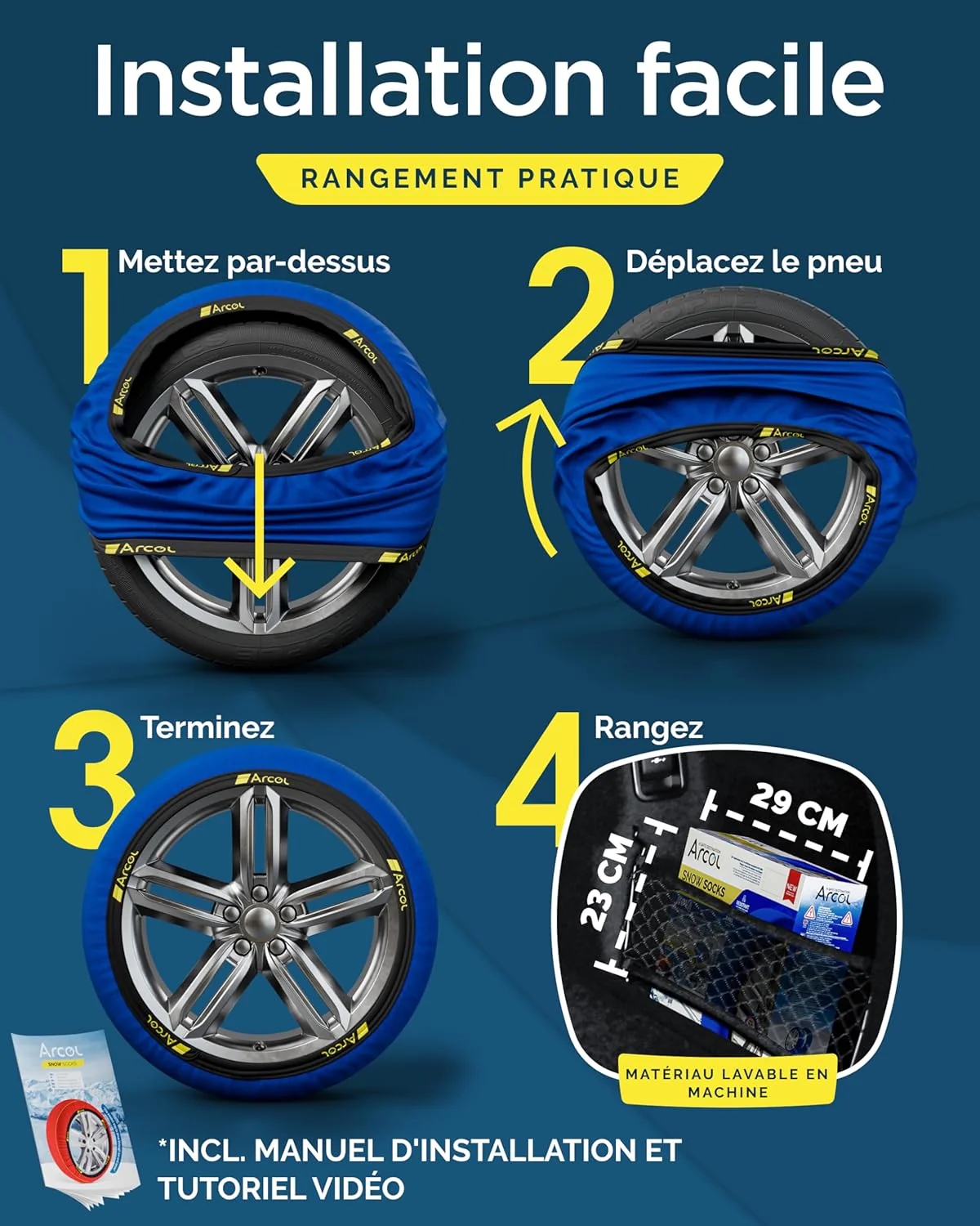 - FACILES A METTRE : 3 ÉTAPES ! Nos chaussettes de neige sont plus légères et faciles à mettre par rapport aux chaînes à neige pour auto classiques. (1) Fixer la chaussette pour la neige sur la partie supérieure du pneu. (2) Déplacer légèrement l’auto pour faire tourner le pneu. (3) Compléter la couverture de la chaussette de neige sur le pneu. Elles sont une alternative pratique aux chaînes de neige pour ceux qui doivent les installer seuls.
