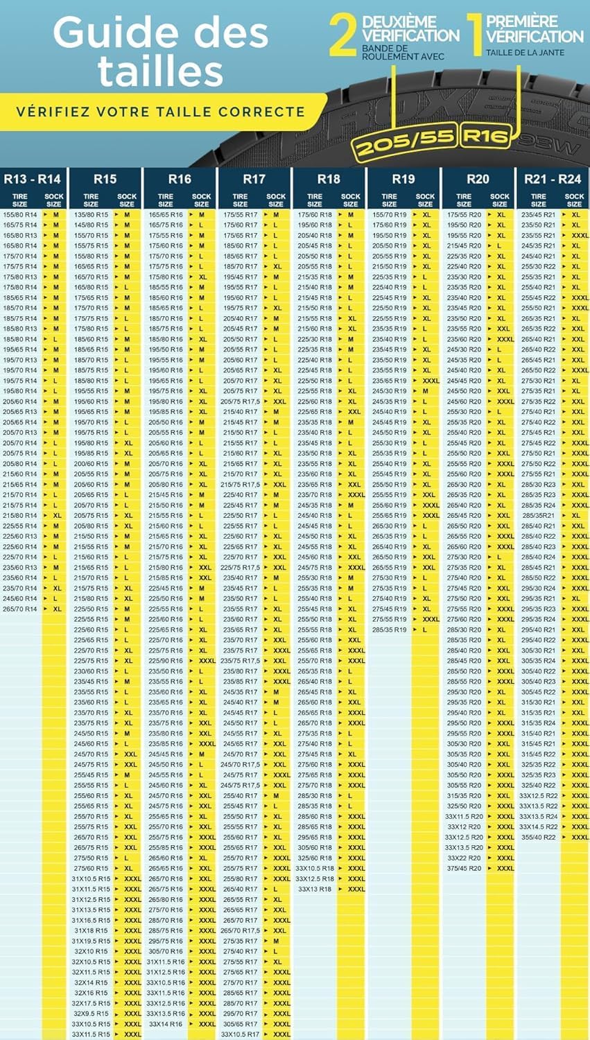 - COMPATIBILITÉ TAILLE M : de la 165/80 R13 jusqu’à la 245/30 R19. Veuillez consulter les images pour avoir une liste de chaque pneu. La chaussette antidérapante Nova est disponible en 3 tailles (M, L, XL). Il existe un set adapté pour chaque véhicule, compatible à tous les véhicules, Citycar, berline, coupé.