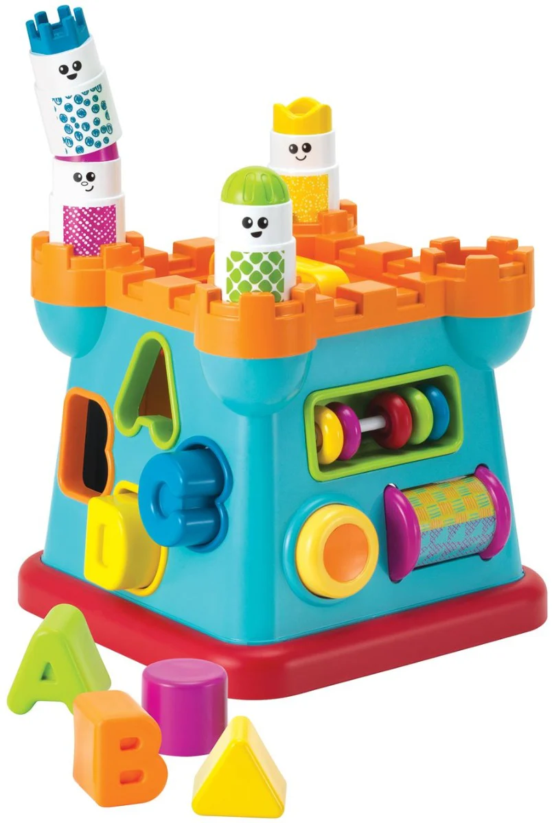 Laat je kindje het plezier ontdekken van dit kleurrijke sorteerspeelgoed in de vorm van een kasteel! De muren van het kasteel zijn versierd met uitsparingen voor verschillende vormen, cijfers en letters, wat helpt bij het leren van vormenherkenning en het ontwikkelen van motorische vaardigheden. Het sorteerkasteel heeft leuke extra’s zoals een knop die een geluid maakt, een kleurrijke roller, en belletjes die van de ene naar de andere kant bewegen. Jouw kindje kan figuren tellen terwijl ze de stenen in de juiste vakjes plaatsen, en de figuren op het kasteel stapelen voor een nieuwe uitdaging. Draai het kasteel om voor nog meer speelplezier!