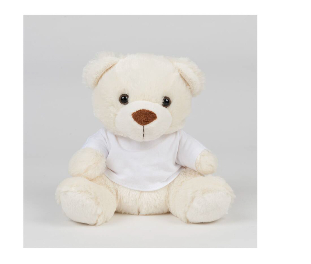 Ourson avec t-shirt. Ourson en peluche avec t-shirt blanc amovible. Conforme à la norme européenne pour les jouets EN71. Convient à tous âges. 100% polyester. T-shirt : 100% coton.