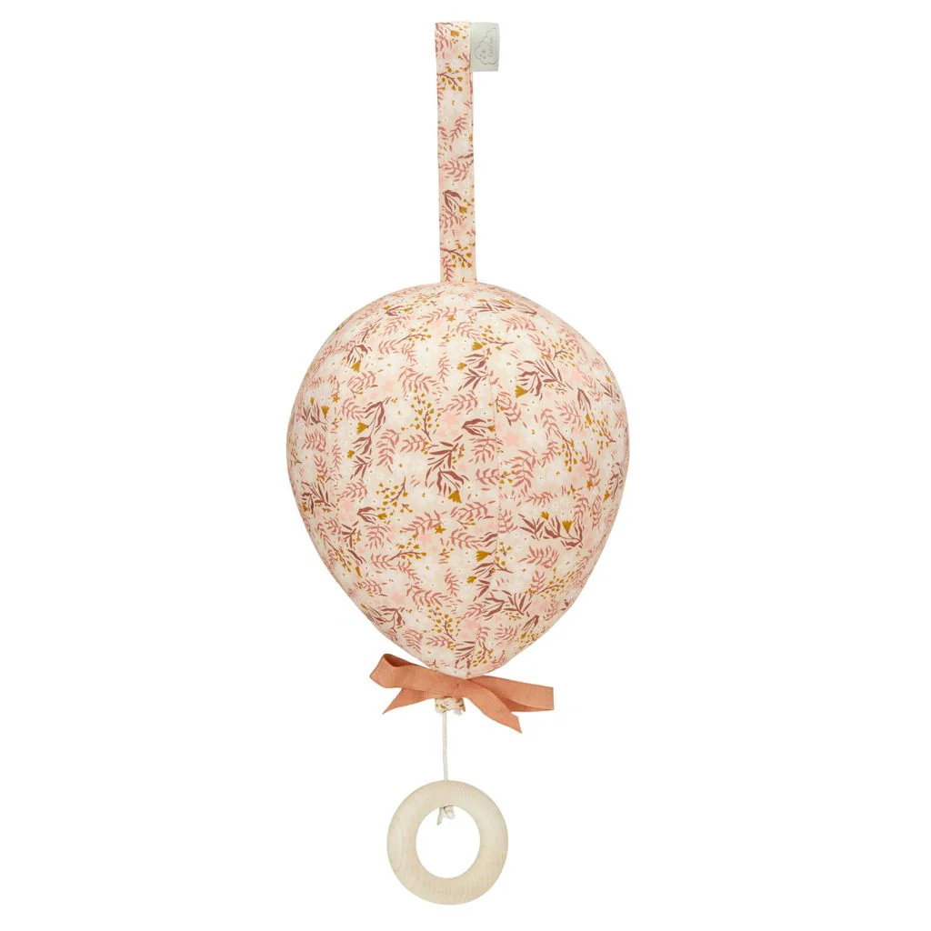 Schattige muziekmobiel voor in de kinderkamer. De mobiel heeft de vorm van een ballon met een strikje van katoenen tape. Wanneer je aan de houten ring trekt hoor je de rustgevende melodie ‘Summertime’ van Gershwin. Houd de ballon met je andere hand vast wanneer je aan de houten ring trekt. De ring is gemaakt van 100% esdoornhout. Het hele muziekdoosje is handgemaakt en wordt geleverd in een prachtige geschenkdoos.