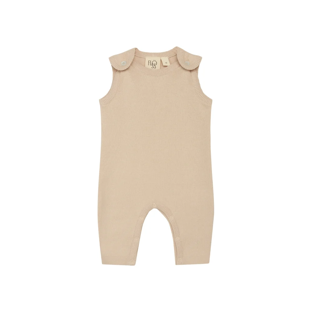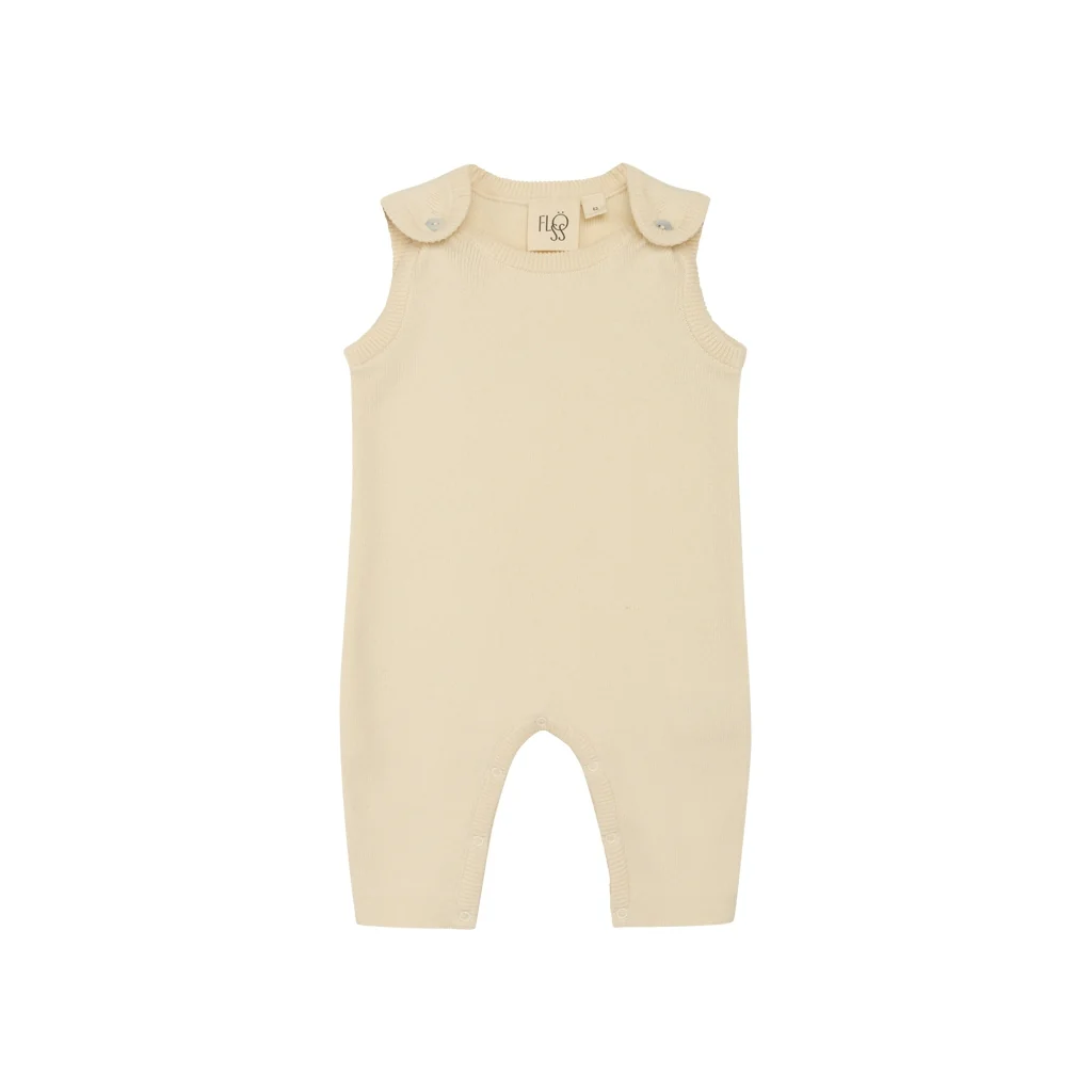Kaya overall is zacht gebreid, gemaakt van biologisch katoen. Mouwloos, parelmoeren knopen voor sluiting en drukknopen voor gemakkelijk aankleden.