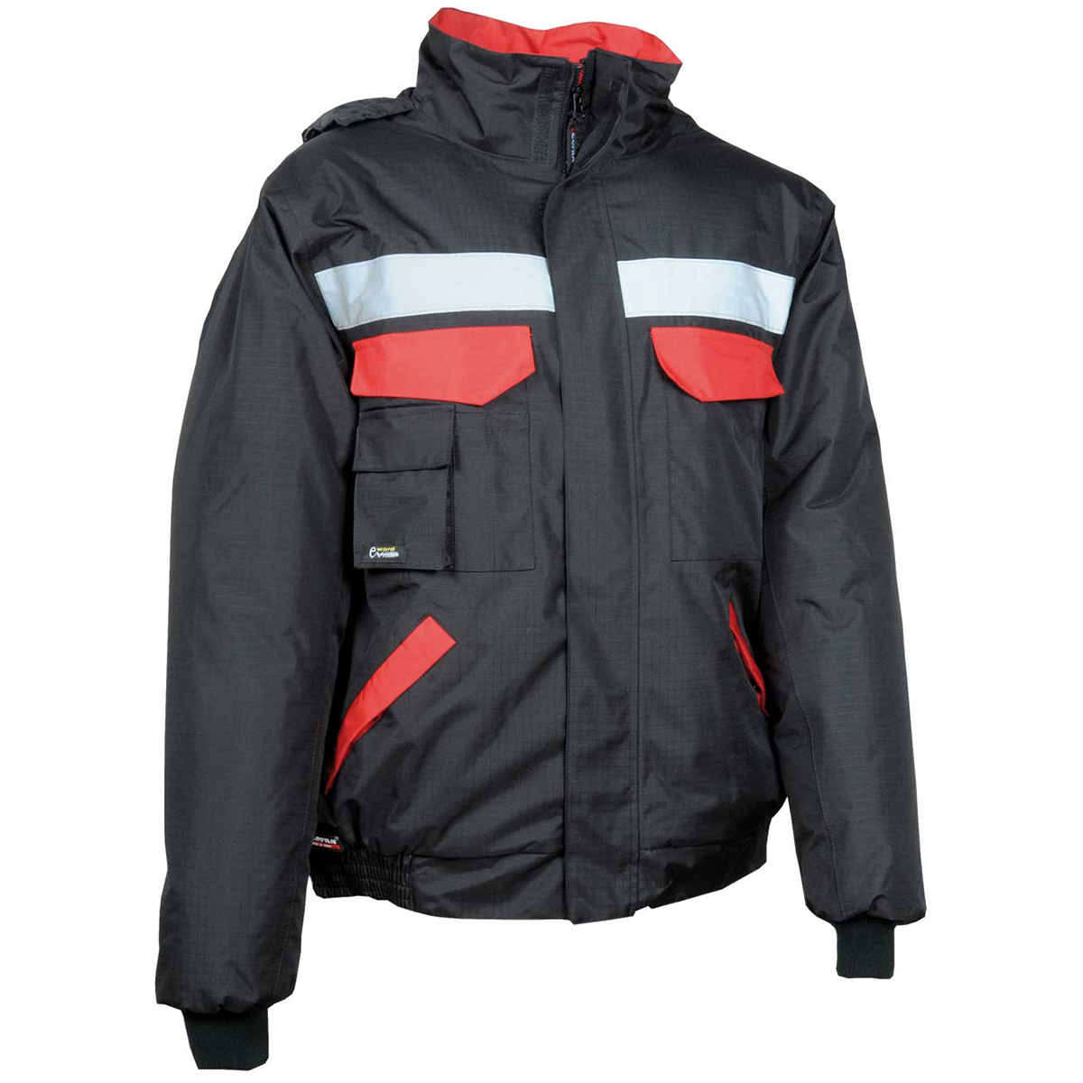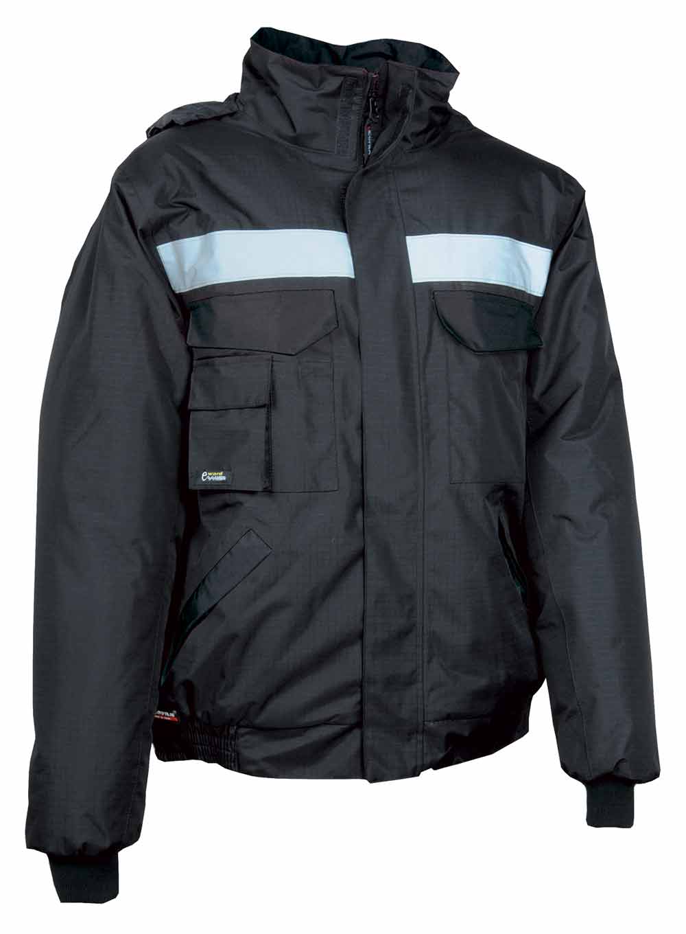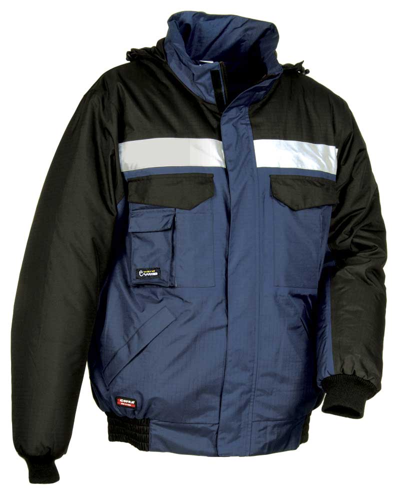 Blouson avec 2 poches larges à l’avant avec snap. 2 poches poitrine avec patte. Bande horizontale réfléchissante avant et arrière Capuche ajustable enroulée dans le col. Coutures étanchées. Poche pour téléphone mobile en tissu E-WARD. Poignets élastiques. Tissu ripstop. Zip intérieure au fond. 100% polyester enduit PVC, 215 g/m², DOUBLURE: 100% polyester, REMBOURRAGE: 100% polyester 160 g/m²