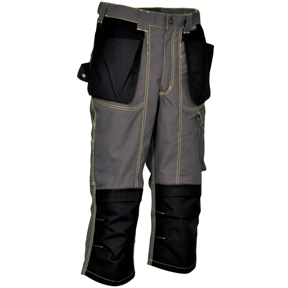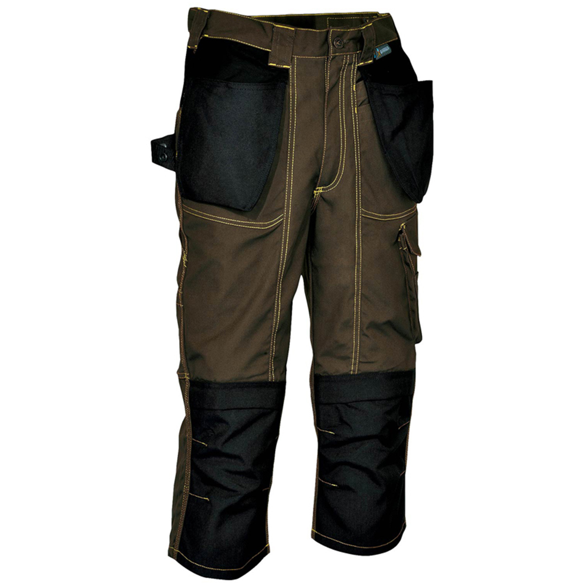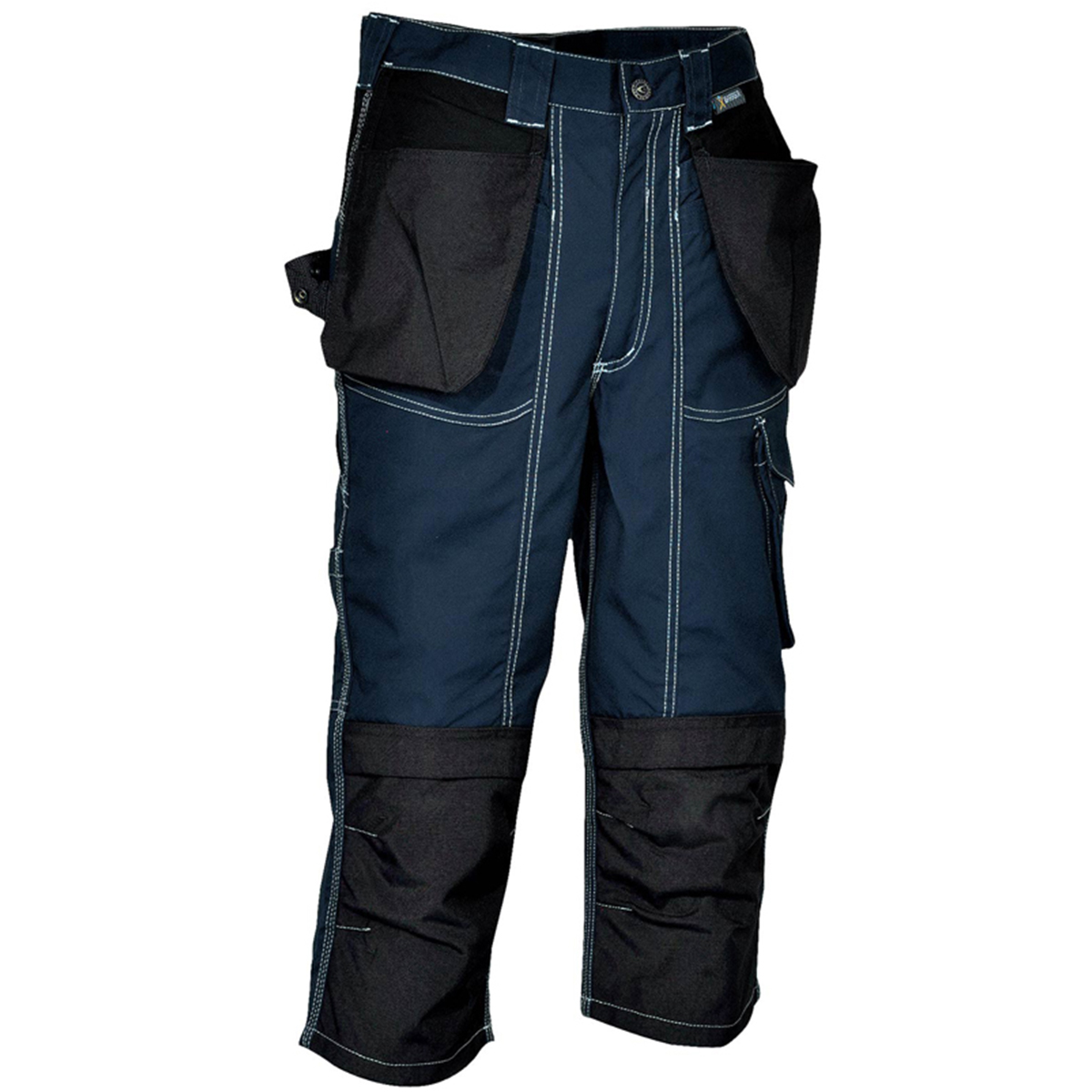 Pantalon de travail avec 4 poches à l’avant. Double poche à l’arrière dont 1 poche avec patte. Entrejambe renforcé. Jambes et genoux à coupe ergonomique. Passant porte-marteau ajustable. Poche latérale. Poche porte-badge. Poche pour mètre pliant. Poches extérieures porte-clous en nylon. Poches pour les genouillères en nylon ajustables. 65% polyester – 35% coton.