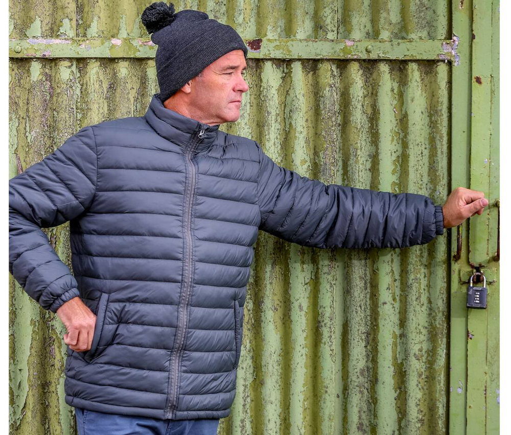 Veste matelassée homme. Coupe-vent et déperlant. 2 poches zippées. Col montant avec mentonnière. Poche poitrine intérieure zippée. Bas ajustable par un cordon de serrage. Rabat de protection interne. Poignets élastiqués. Isolation 300g en 100% polyester. 5 cm entre les coutures. Accès marquage. Extérieur : 100% nylon 20D. Doublure : 100% nylon 20D.