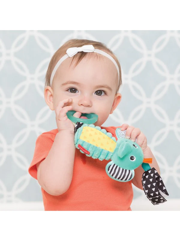 Deze vrolijke meeneem vriendjes verbergen een vrolijke geluid binnenin. Bevat een BPA-vrije bijtring. Moedigt aan om te grijpen en spelen. Gemakkelijk te bevestigen aan autostoelen, kinderwagens en speelkleden.