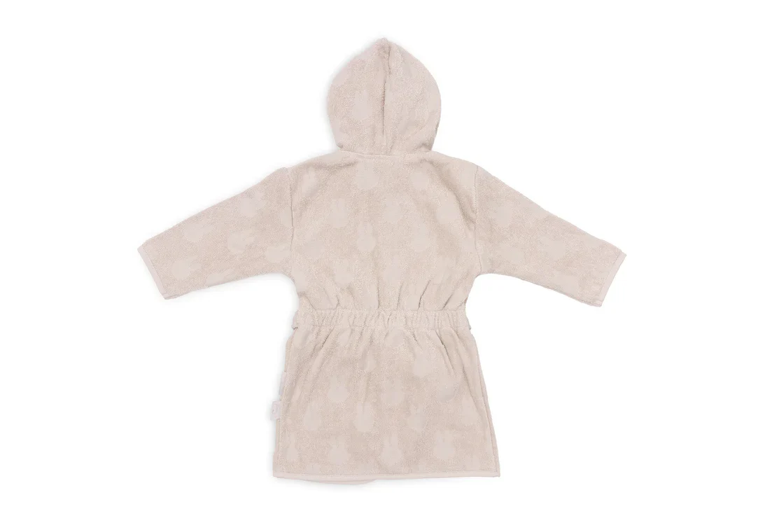 Het badjasje heeft een handig drukknoopje om hem dicht te houden bij het dragen, elastiek in het rugpand voor de perfecte pasvorm en de ceintuur zit aan het badjasje vast zodat je hem niet kan verliezen. Het badjasje is effen van kleur en in de badstof is Nijntje ingeweven. Verkrijgbaar in olive green, nougat en wild rose.