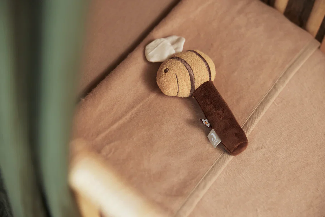 Daag je kleine uit met deze schattige rammelaar Spring Garden Bee van Jollein. Binnenin het bijtje zit ook een belletje waardoor de zintuigen van de baby geprikkeld worden. Deze rammelaar van teddy en velvet stof is makkelijk te pakken en vast te houden. Het is niet erg als jouw kindje de rammelaar na het grijpen ook weer laat vallen.