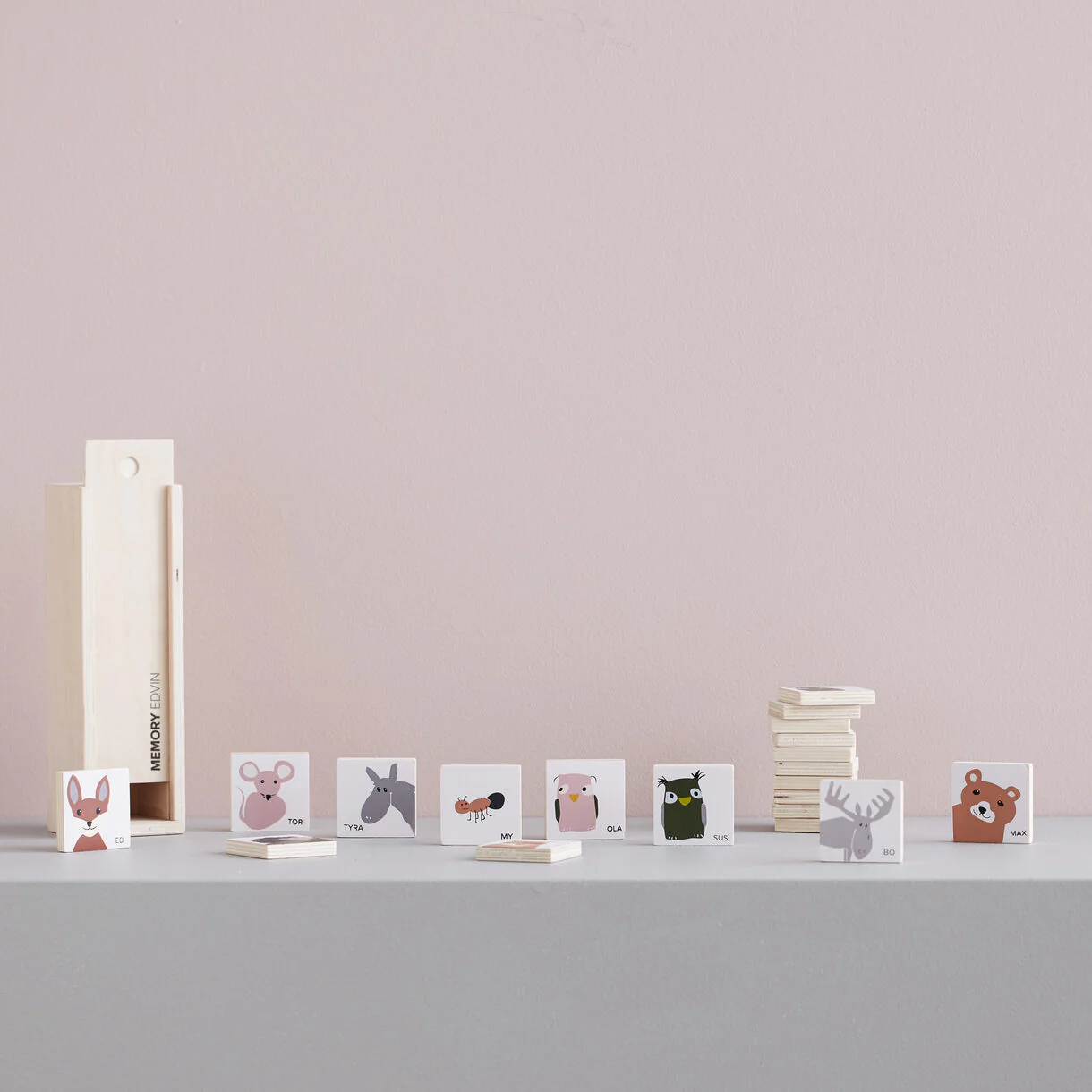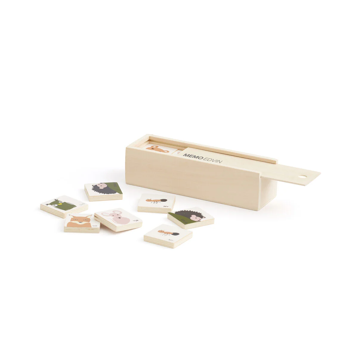 Ontdek het plezier van het Klassieke Memospel uit de schattige Edvin-serie! Dit prachtige memospel is vervaardigd uit multiplex en bevat 10 verschillende symbolen, elk met een uniek dier. Maak kennis met Bo de eland, Ed de vos, Lo de lynx, Ola de roze uil, Stella de egel, Sus de groene uil, Tor de muis, Max de beer, en Mijn de mier.