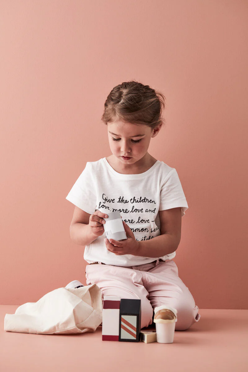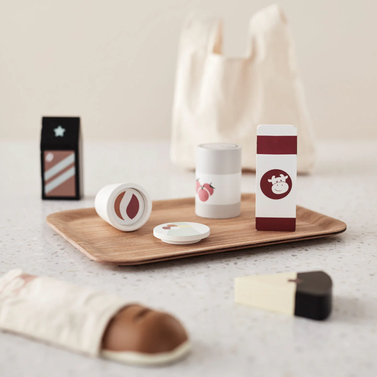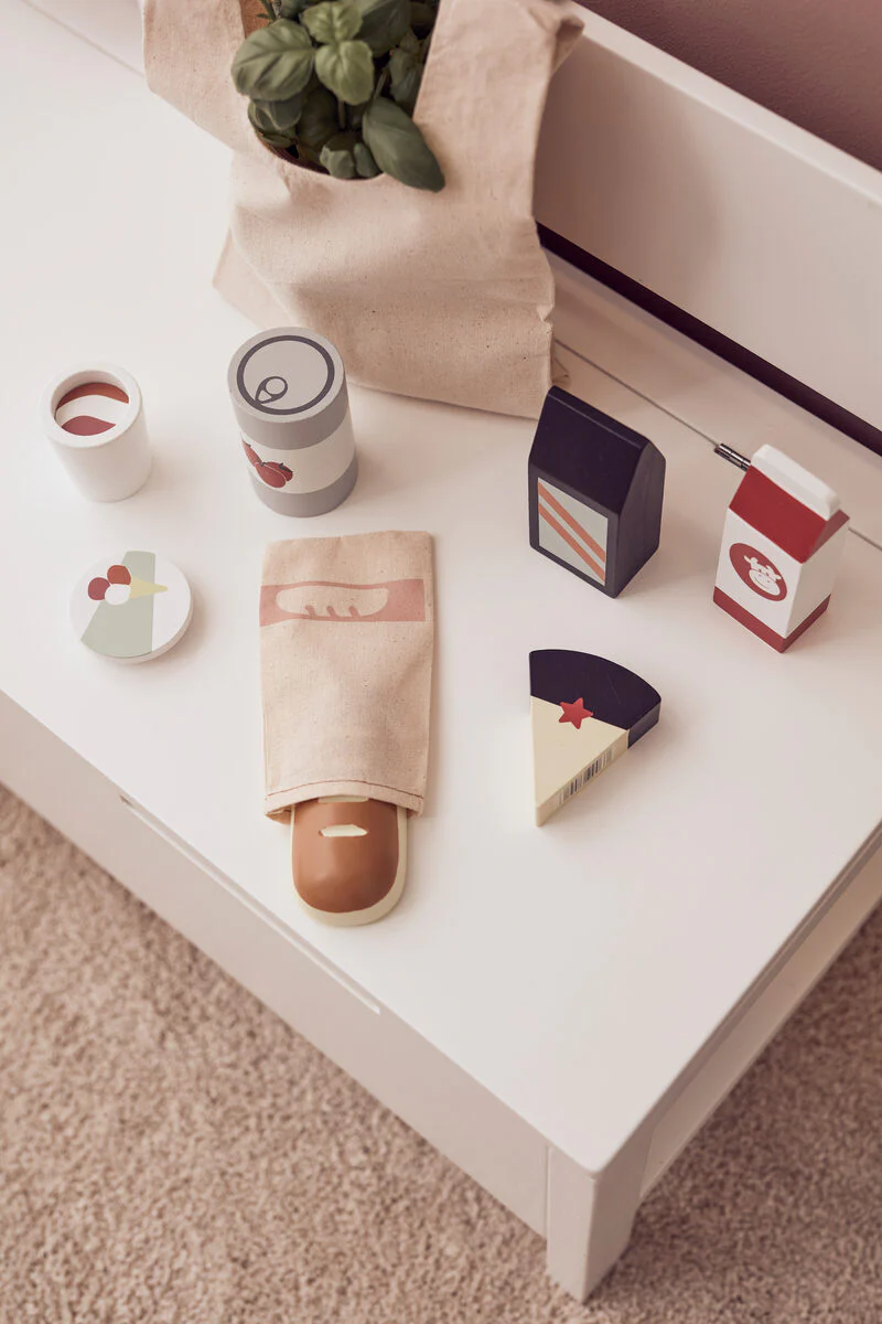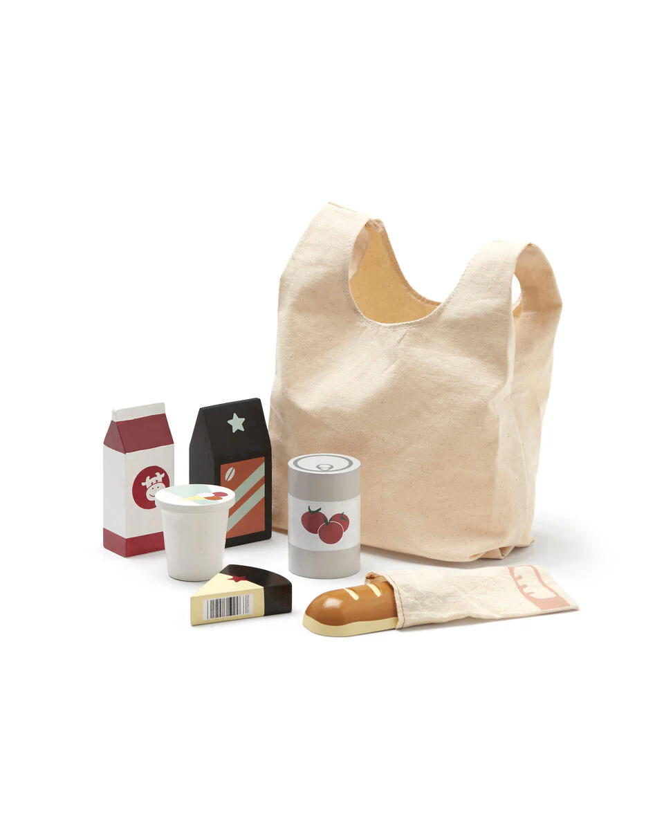 Doe de wekelijkse boodschappen met deze boodschappenset. De set is perfect voor fantasiespel en wordt geleverd met koffie, kaas, melkkan, ijspot, ingeblikte tomaten, brood in een katoenen zak. Zet de producten neer in de fantasiewinkel, betaal het eten en neem al het eten mee naar huis in de boodschappentas.