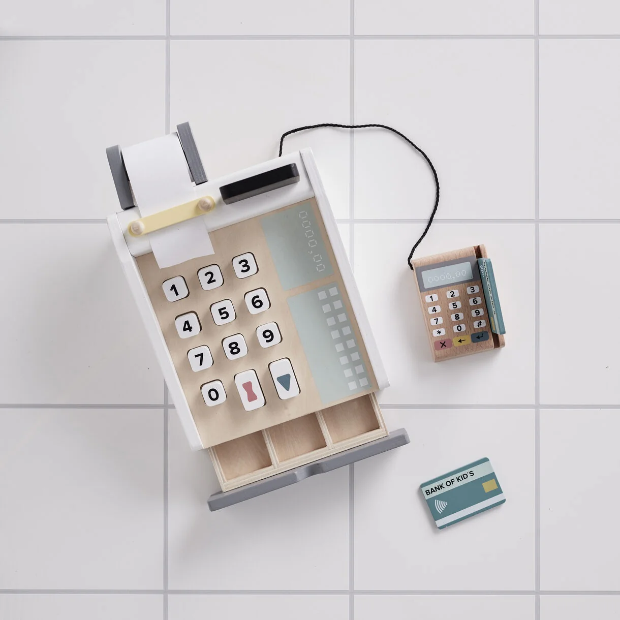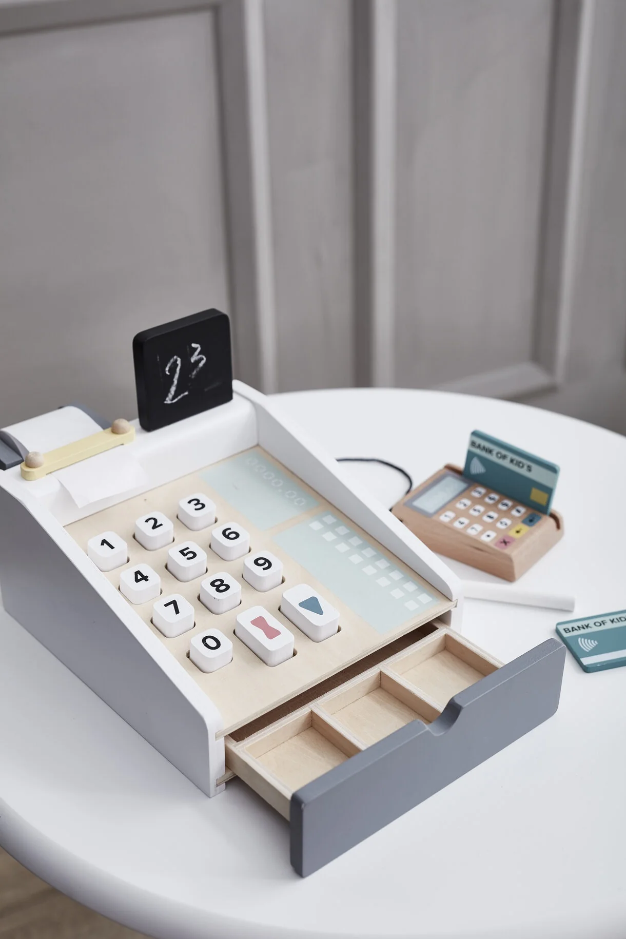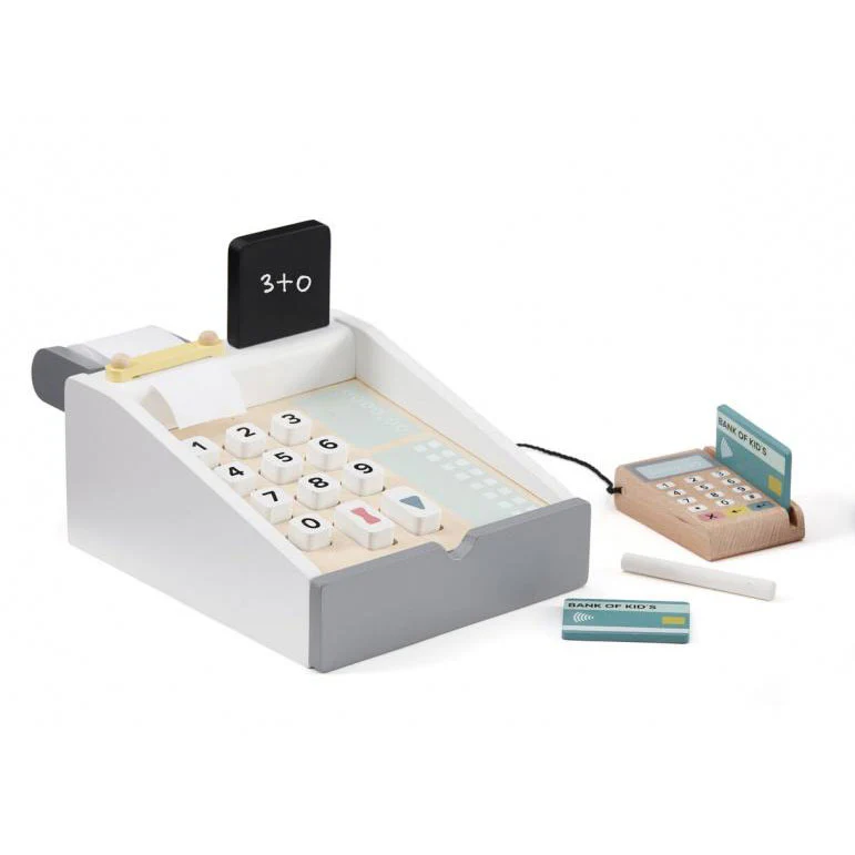 Ka-ching! Met deze houten kassa van Kid’s Concept kunnen kinderen van alles kopen en verkopen. Perfect voor in een kleine kiosk of winkel. De kassa heeft knoppen om in te drukken, een bord om prijzen op te schrijven, vakken voor brief- en muntgeld en een kaartlezer met twee kaarten.