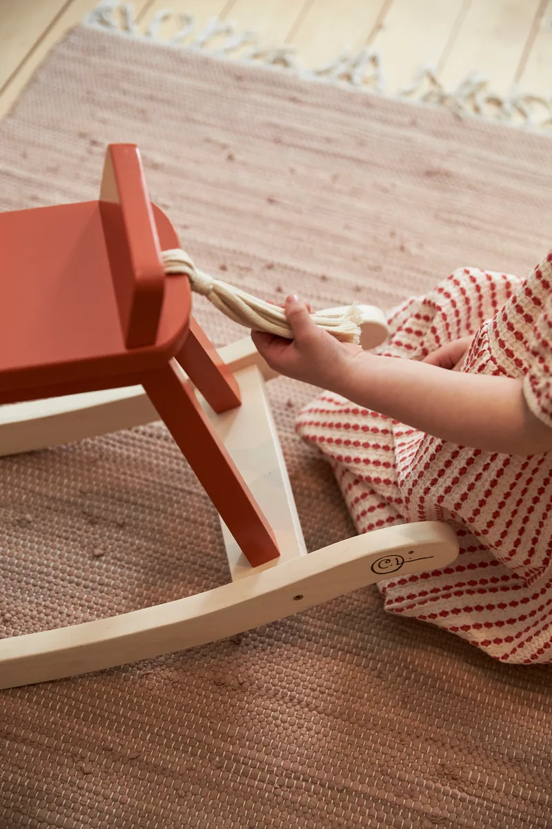 Het hobbelpaard is ontworpen met veiligheid en duurzaamheid in gedachten. De stevige handvatten en schommelrails met anti-kantelbescherming zorgen ervoor dat je kleintje veilig kan spelen. Het paard is gemaakt van FSC-gecertificeerd hout, met een prachtige knoopmethode voor de staart geïnspireerd op Karins textielwerk. Aan de zijkant van de rails is Carl Larsson’s handtekening gebrand, wat een unieke artistieke touch toevoegt.