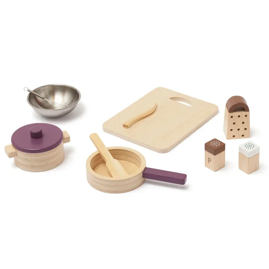 De ultieme houten speelkokset is ideaal voor het koken op onze fornuizen! De set bevat een pot, pan, een metalen kom met garde, een rasp, peper- en zoutbakjes, snijplank en mes. Het is een geweldige aanvulling op elke houten speelkeuken en biedt urenlang speelplezier. De set stimuleert fantasierijk rollenspel en helpt kinderen hun creativiteit en motorische vaardigheden te ontwikkelen. Het mes en de snijplank zijn lakvrij en kunnen worden behandeld met voedselveilige olie voor extra veiligheid.