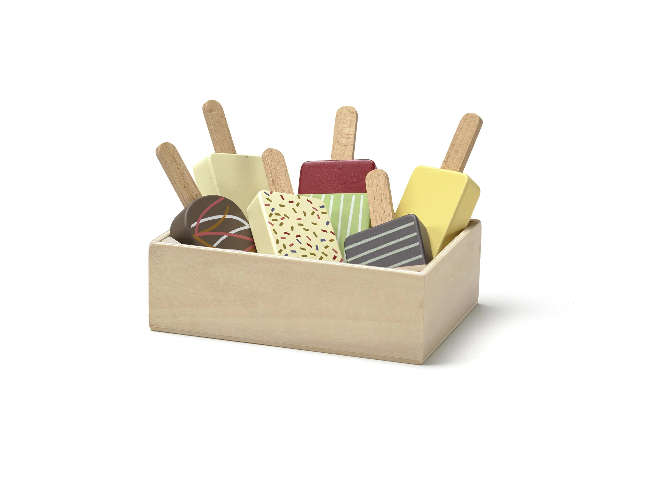 6 gesorteerde houten ijslolly’s in een houten box. Kenmerken Aanbevolen leeftijd: 36 maanden Kleur: Multikleur Andere afmetingen: IJslolly’s: 12 x 4 x 1,5 cm Aantal onderdelen: 7 Gewicht (g): 255 Productafmetingen cm (LxBxH in cm): 14 x 10 x 4