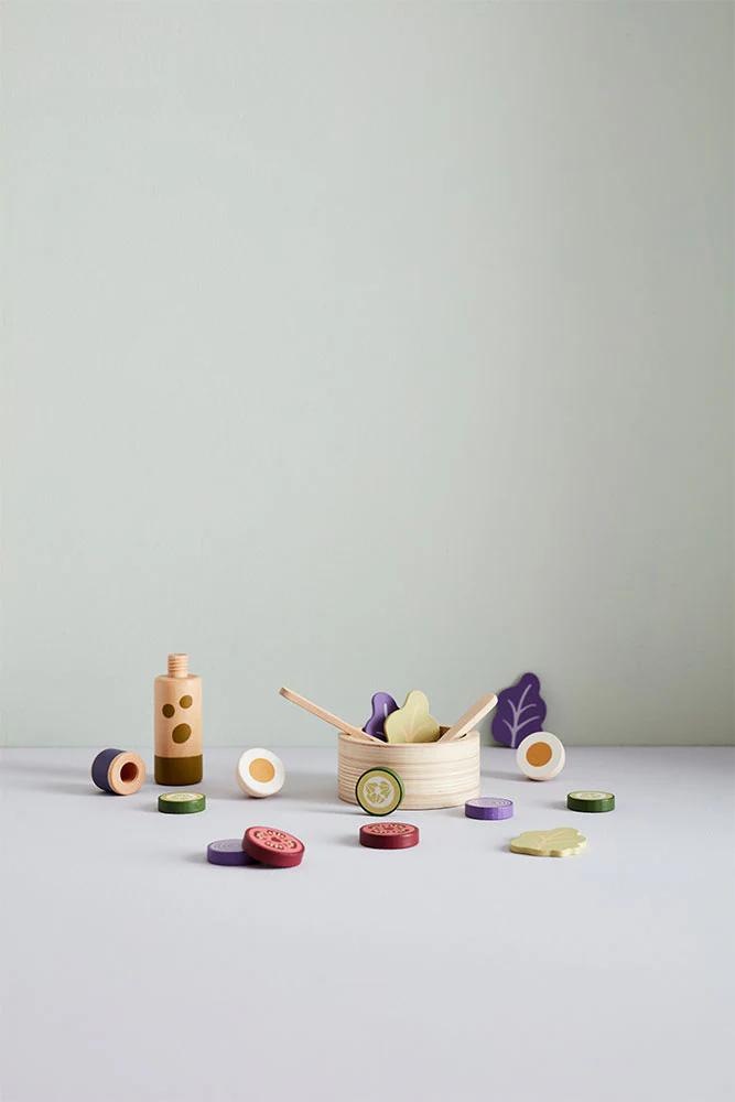 Deze houten slakom uit het Kid’s Hub concept is perfect als het tijd is om restaurantje te spelen. Doordat de speelgoedschaal is gemaakt van multiplex en een hoge rand heeft, zie je aan de zijkant de fijne nerf. Maar een slakom is niets zonder zijn speelgoedvoedsel. In deze lekkere salade vind je eierhelften, slablaadjes, tomaten, plakjes komkommer en rode ui. Vergeet niet de dop van de fles los te draaien en alles af te werken met olijfolie. Mix met het saladebestek en voilà – een super lekkere lunch voor je vrienden. En als je de lunch to-go nodig hebt? Verpak het gewoon in de meegeleverde papieren zak.