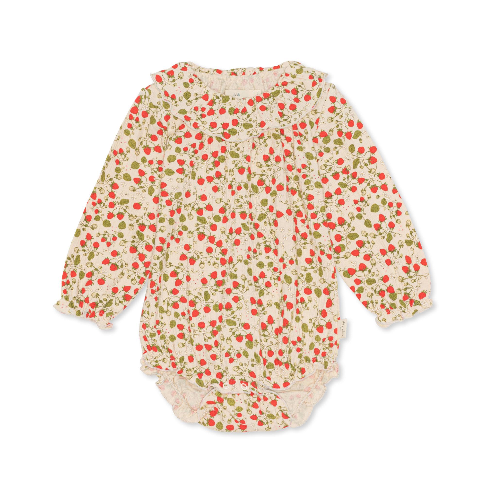 Konges Sløjd Chleo Body Confiture is een rompertje met een leuk aardbeien printje. Het kraagje en de mouwen hebben een leuk golvend detail wat de romper helemaal afmaakt. De stof is zacht en zit comfortabel. Het rompertje is makkelijk aan te trekken door de drukknopjes aan de onderkant.