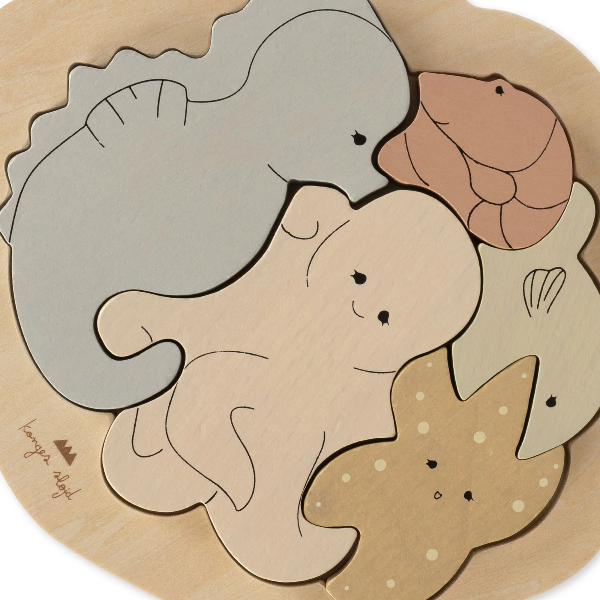 Puzzel gemaakt met een beukenhouten frame en dennenhouten blokken geverfd met niet-giftige verf op waterbasis, beide afkomstig uit duurzaam beheerde bossen. Het frame heeft de vorm van een schelp met verschillende zeedieren eronder.