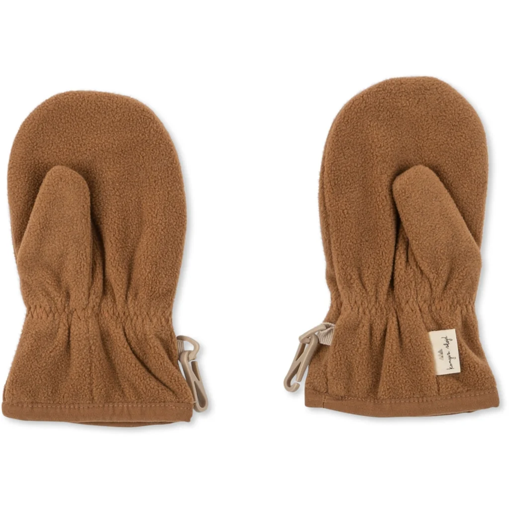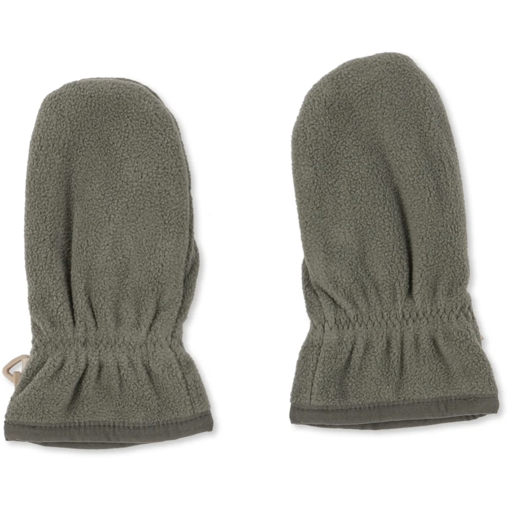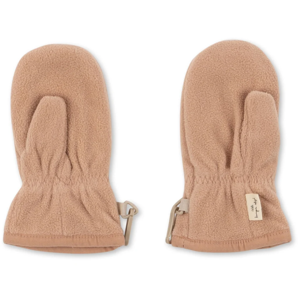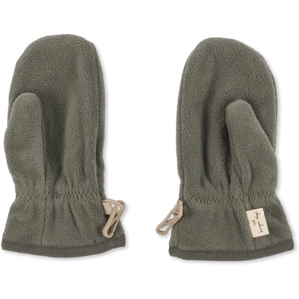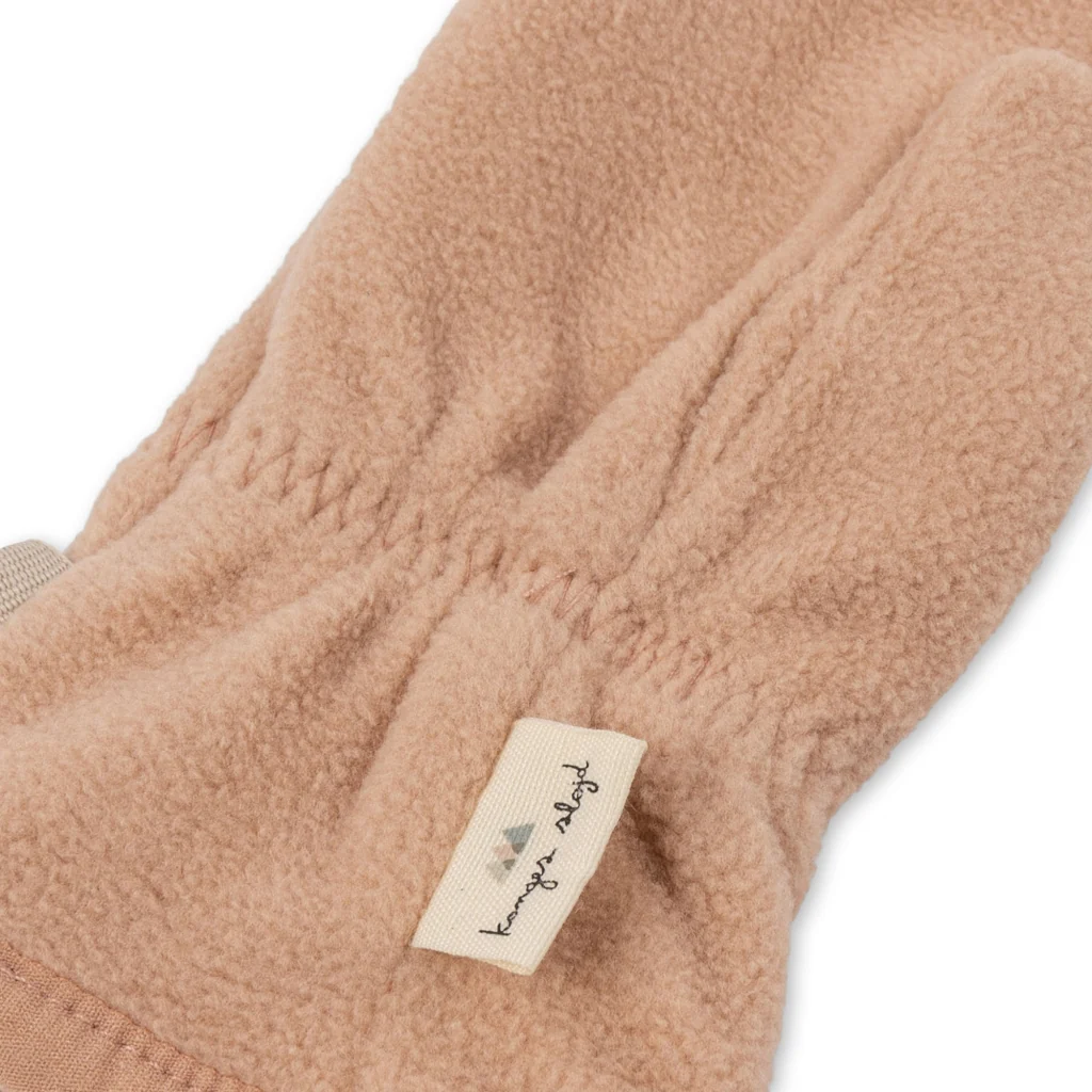 Lichte en zachte wanten gemaakt van 100% gerecycled polyesterfleece. De wanten zijn voorzien van een praktisch duimstuk. Elastiek rond de pols houdt de wanten op hun plek. Een handige dubbele karabijnhaak kan aan een klein katoenen lusje van verschillende andere bovenkledingstijlen van Konges Sløjd worden bevestigd, zodat het kind deze niet kwijtraakt tijdens het spelen of als hij zich warm voelt. Wanneer de wanten niet in gebruik zijn, kunnen de karabijnhaken gebruikt worden om het paar bij elkaar te houden.