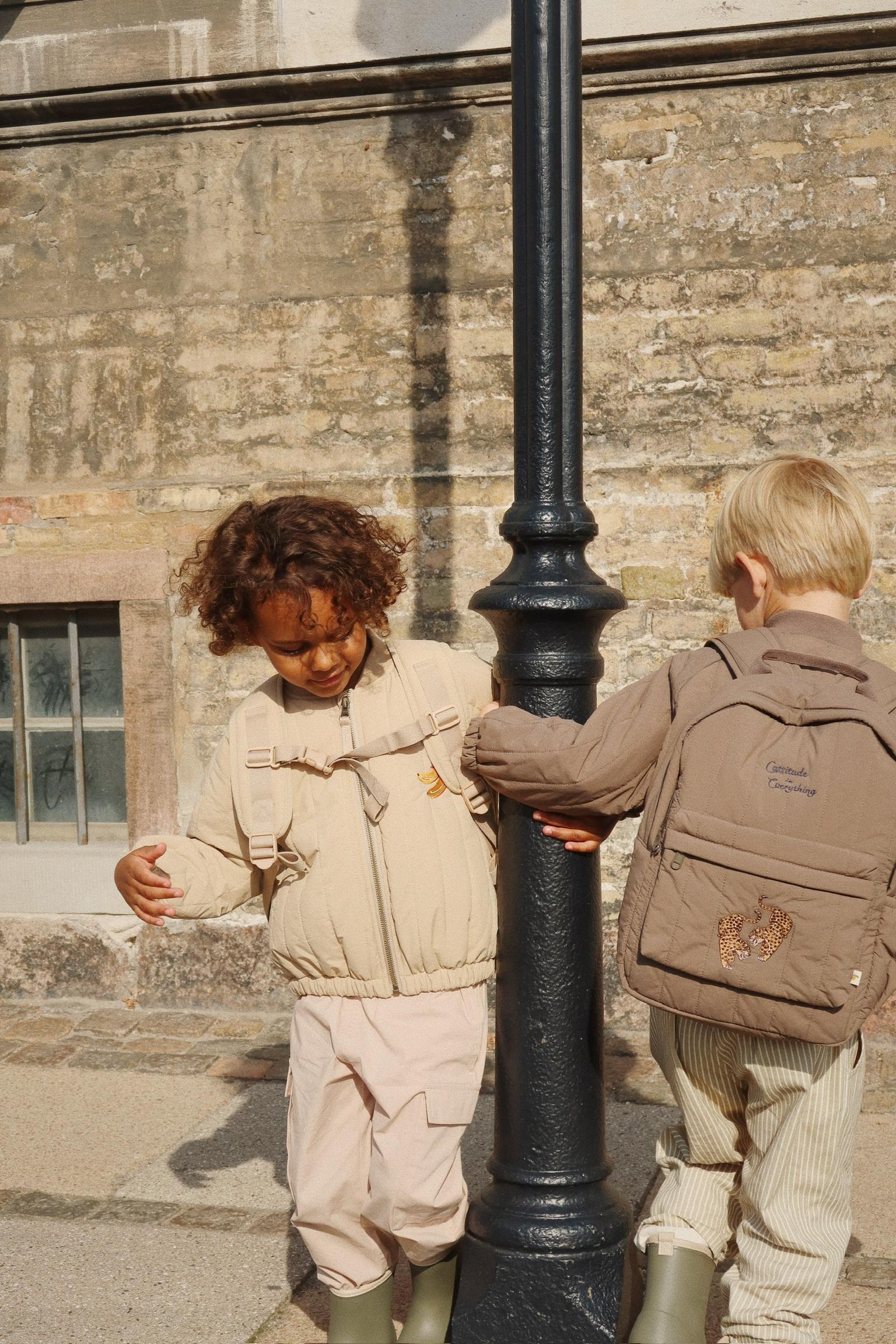 Ruime rugzak van Konges Slojd. De rugzak is zeer licht, wat een belangrijke ergonomische factor is. Aan de bovenkant heeft het een stevige lusophanging om vast te houden of op te hange. In het grote vak van de tas heb je de mogelijkheid de naam van je kindje te schrijven.