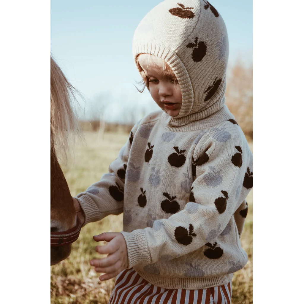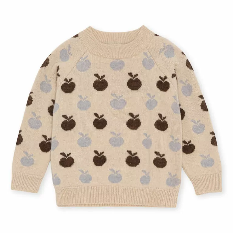 Het is een creme-kleurige trui en vooral de appeltjes maken’m onweerstaanbaar. Multi pomme, zoals Konges de print noemt: grijze en bruine appeltjes op een off-white ondergrond.