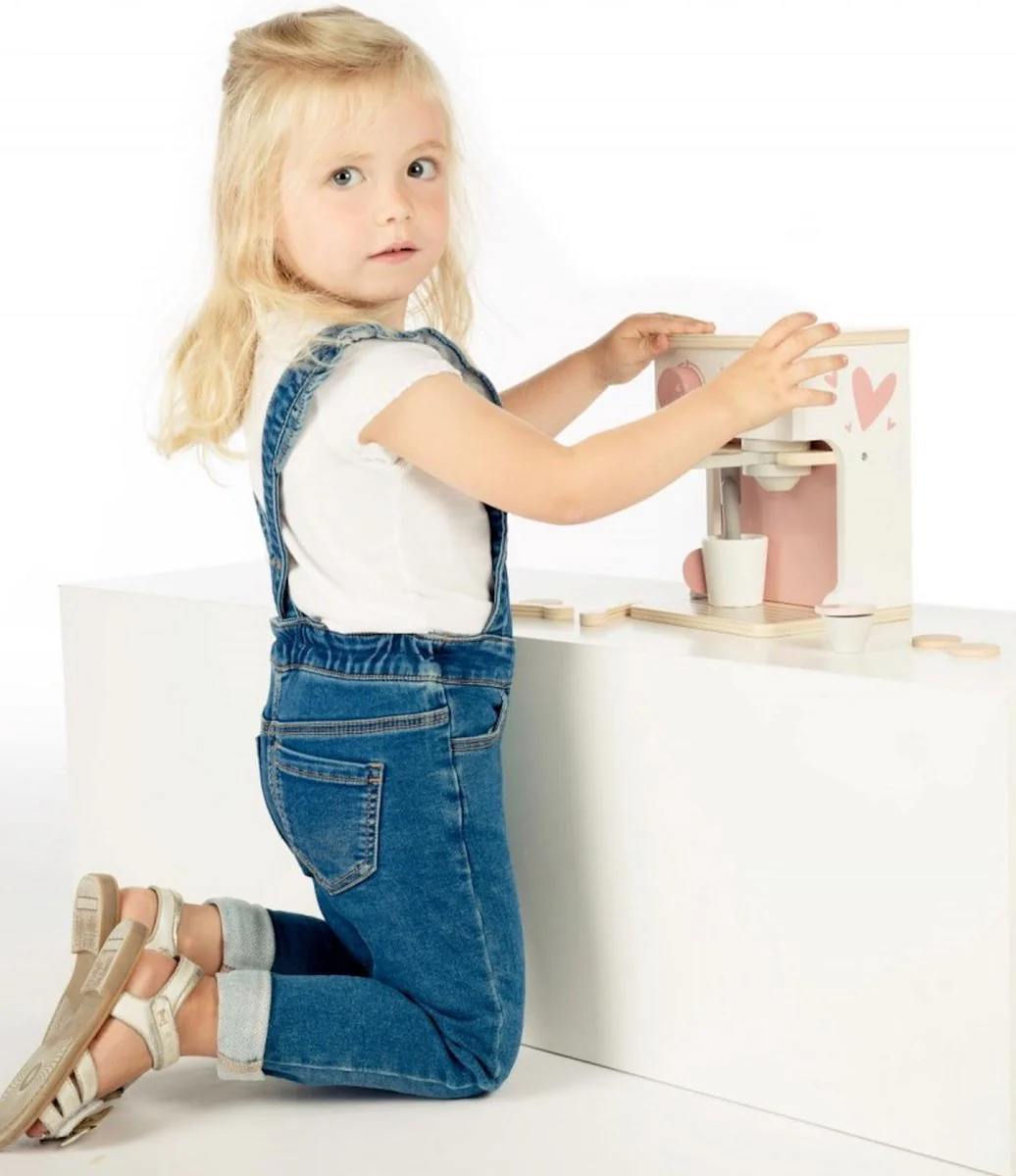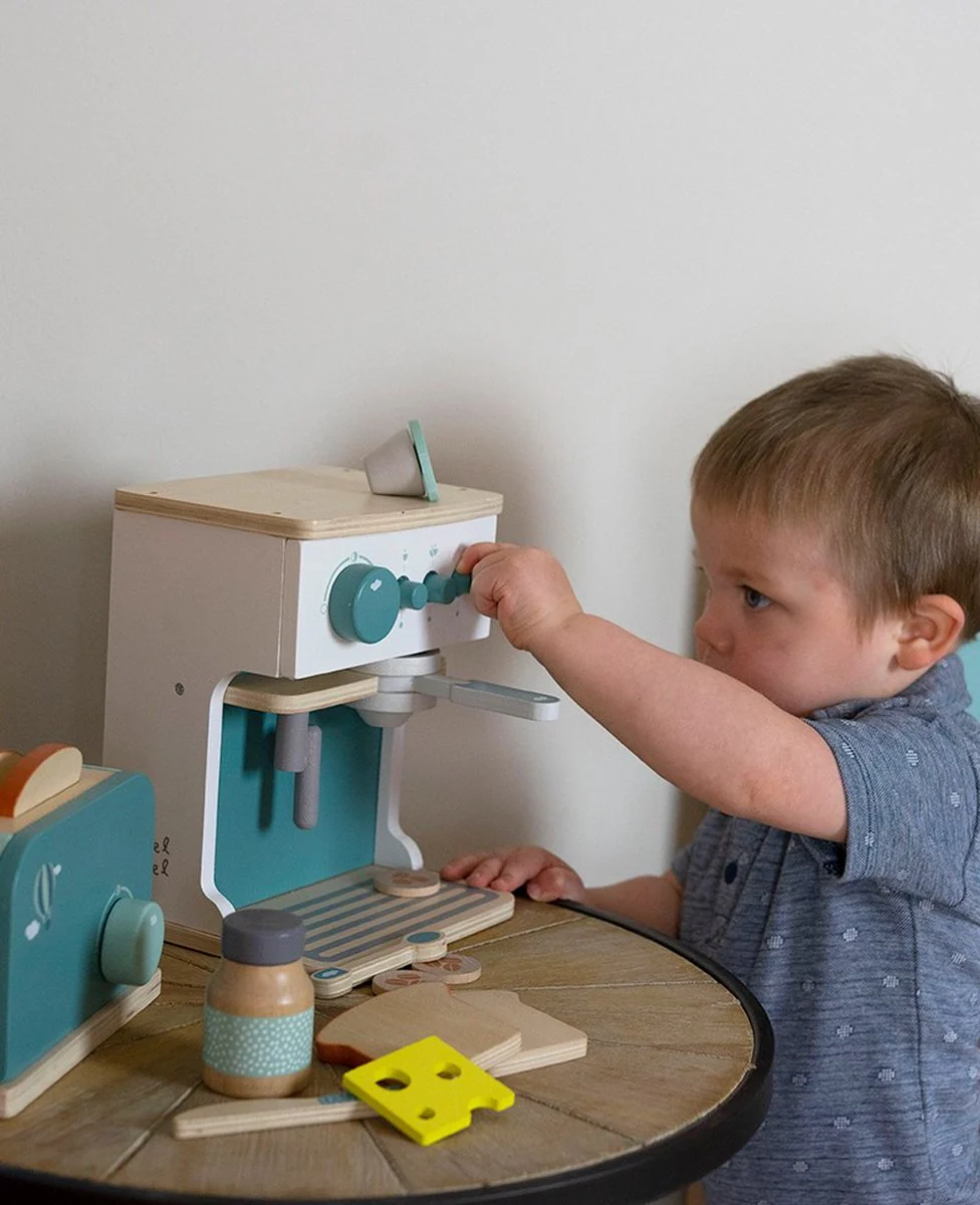 Laat je kleintje genieten van het perfecte kopje koffie met de duurzame Label Label houten espresso machine – een ideale aanvulling op elke speelkeuken!