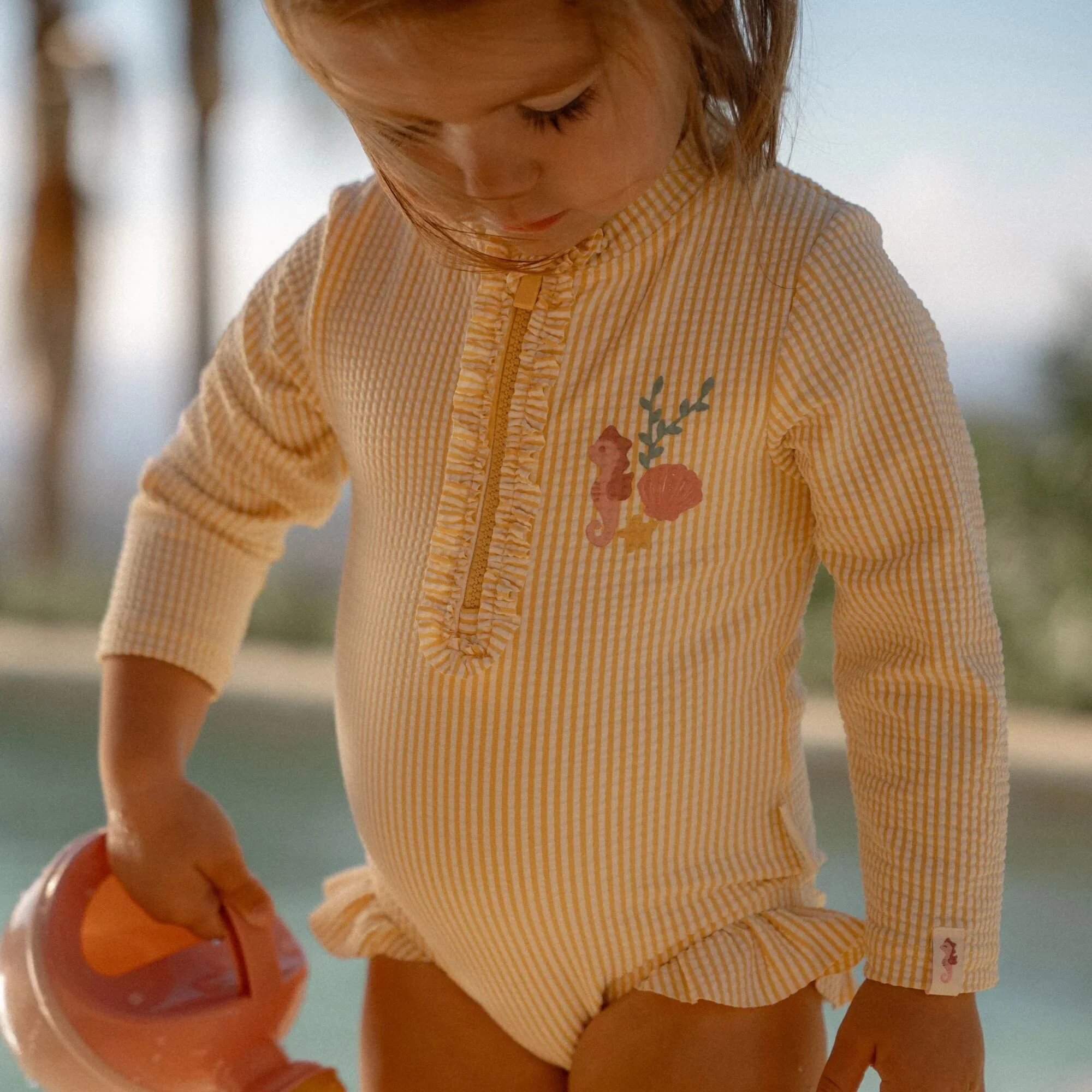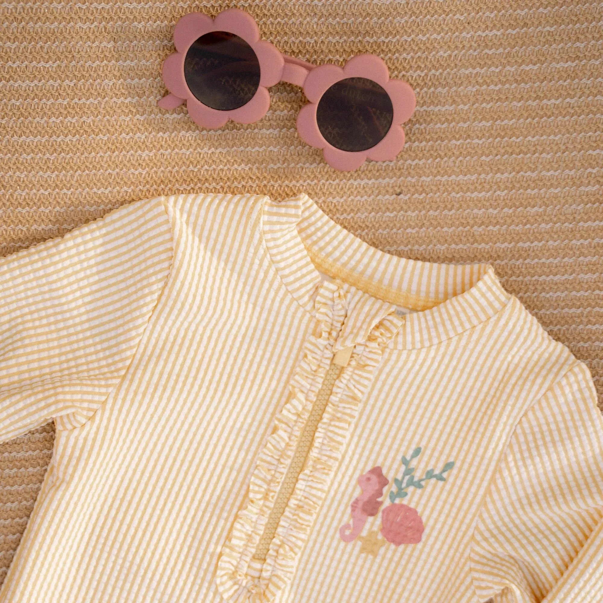Op naar de golven! Met dit vrolijke badpak is jouw kleintje helemaal klaar voor een dag vol strandpret. Het Ocean Treasures badpak met lange mouwen heeft een speels dessin van gele en witte streepjes en een schattig roze zeepaardje als detail. De ruches aan de beenopeningen geven het een meisjesachtige en zomerse uitstraling. Dankzij de praktische drukknoopsluiting op de rug is aan- en uitkleden eenvoudig, zelfs als je kindje nat en zanderig is. De maten 62/68 en 74/80 zijn voorzien van extra drukknoopjes in het kruis, ideaal voor een snelle luierwissel. Gemaakt van zachte, sneldrogende stof en perfect om je kleintje comfortabel en beschermd te laten genieten van de zon.