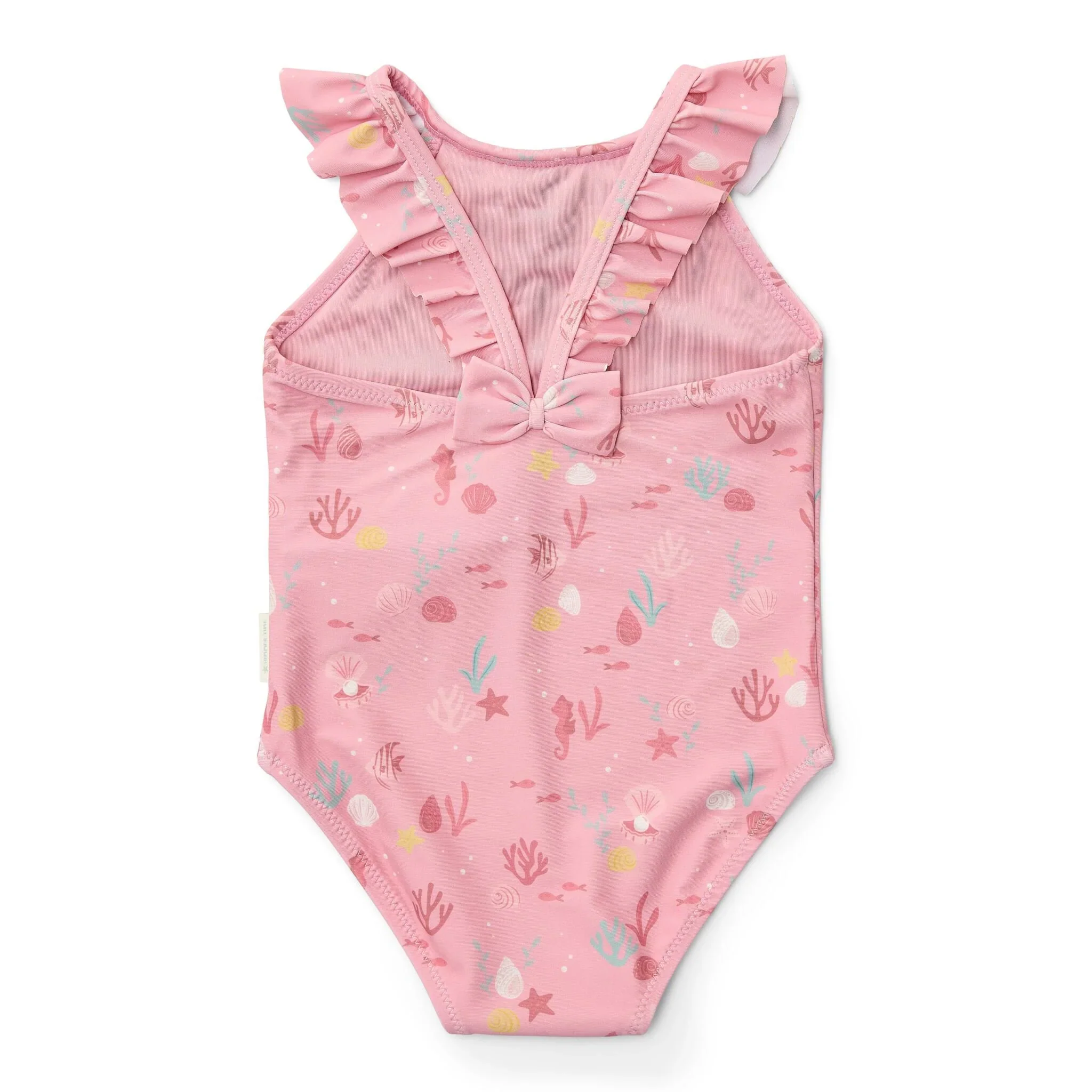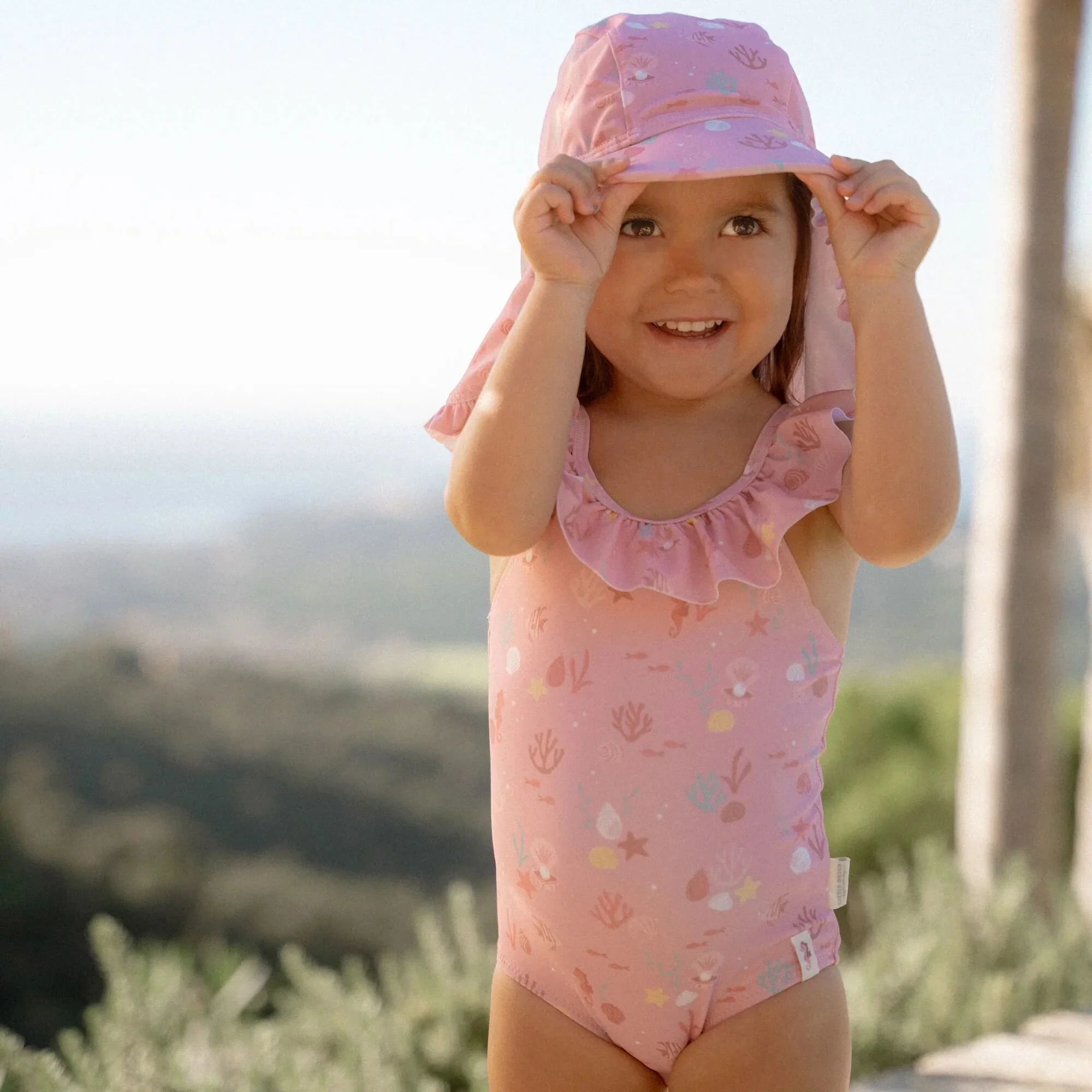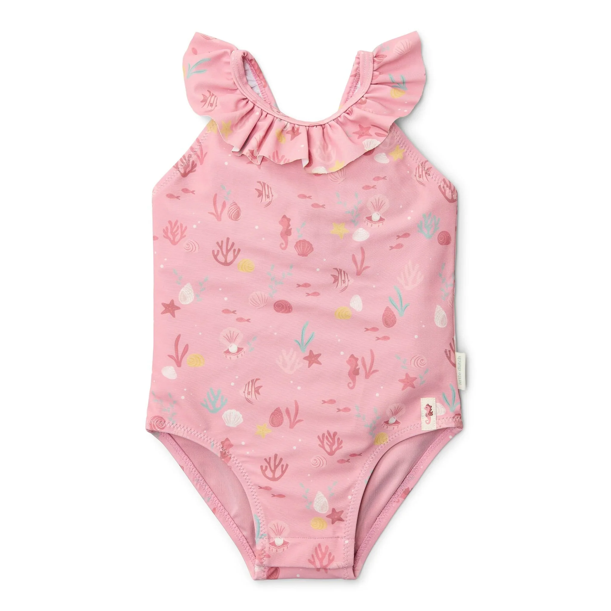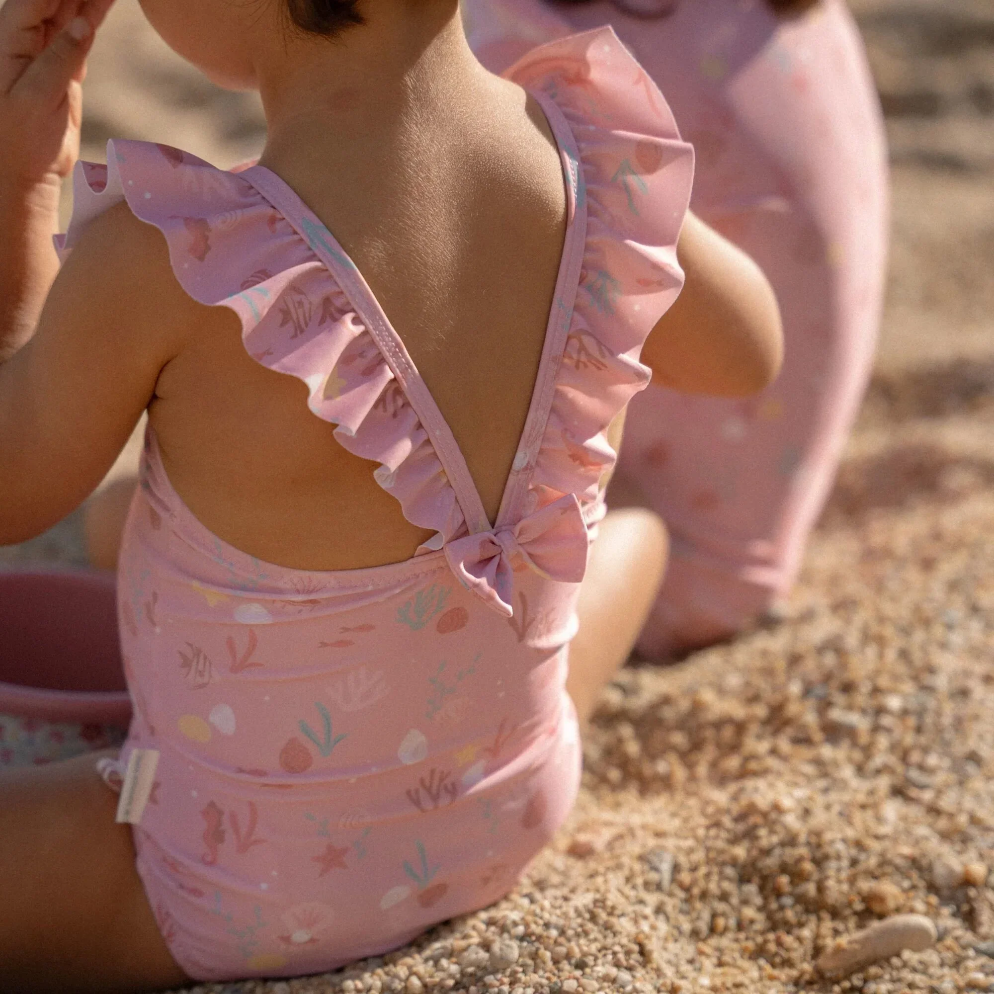 Laten we een verfrissende duik nemen! Dit speelse badpak met het charmante Ocean Treasures-dessin is perfect voor zomerse waterpret. De lichtroze basis is versierd met zeepaardjes, schelpen en koraal, wat zorgt voor een vrolijk onderwaterthema dat je kleintje laat stralen. De ruches op de schouderbandjes geven het geheel een schattige finishing touch.