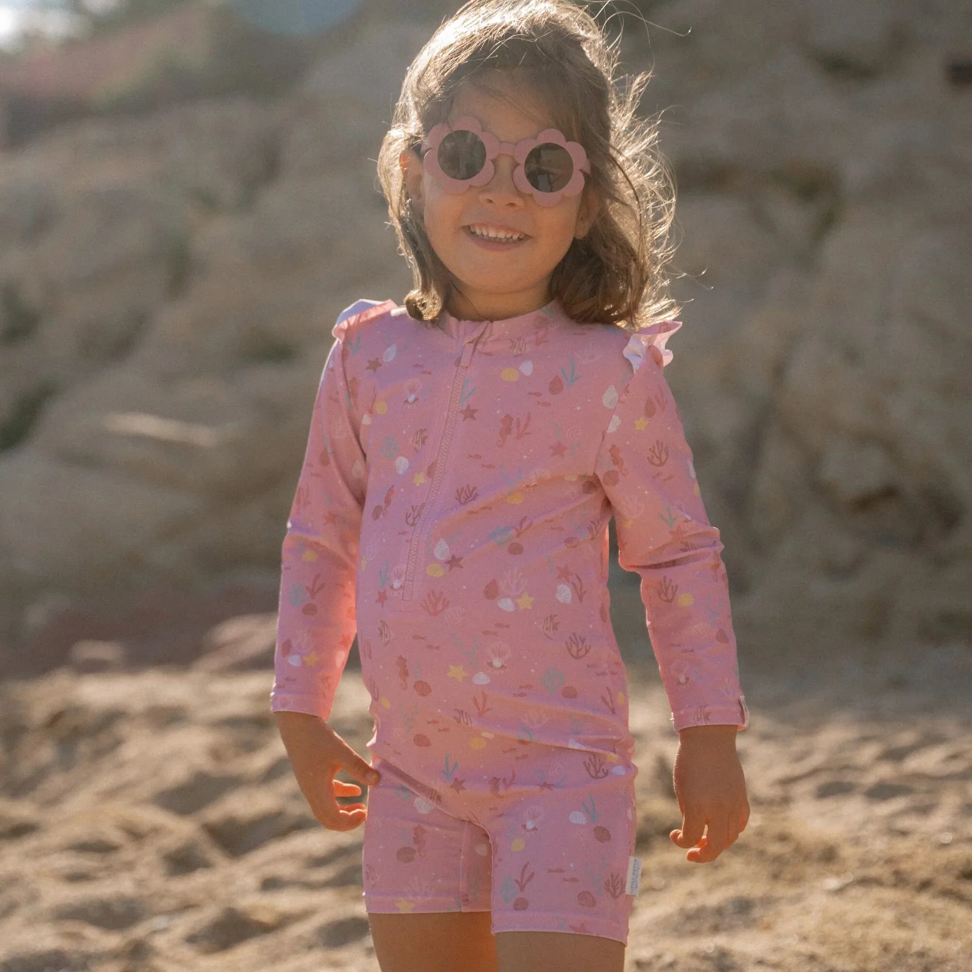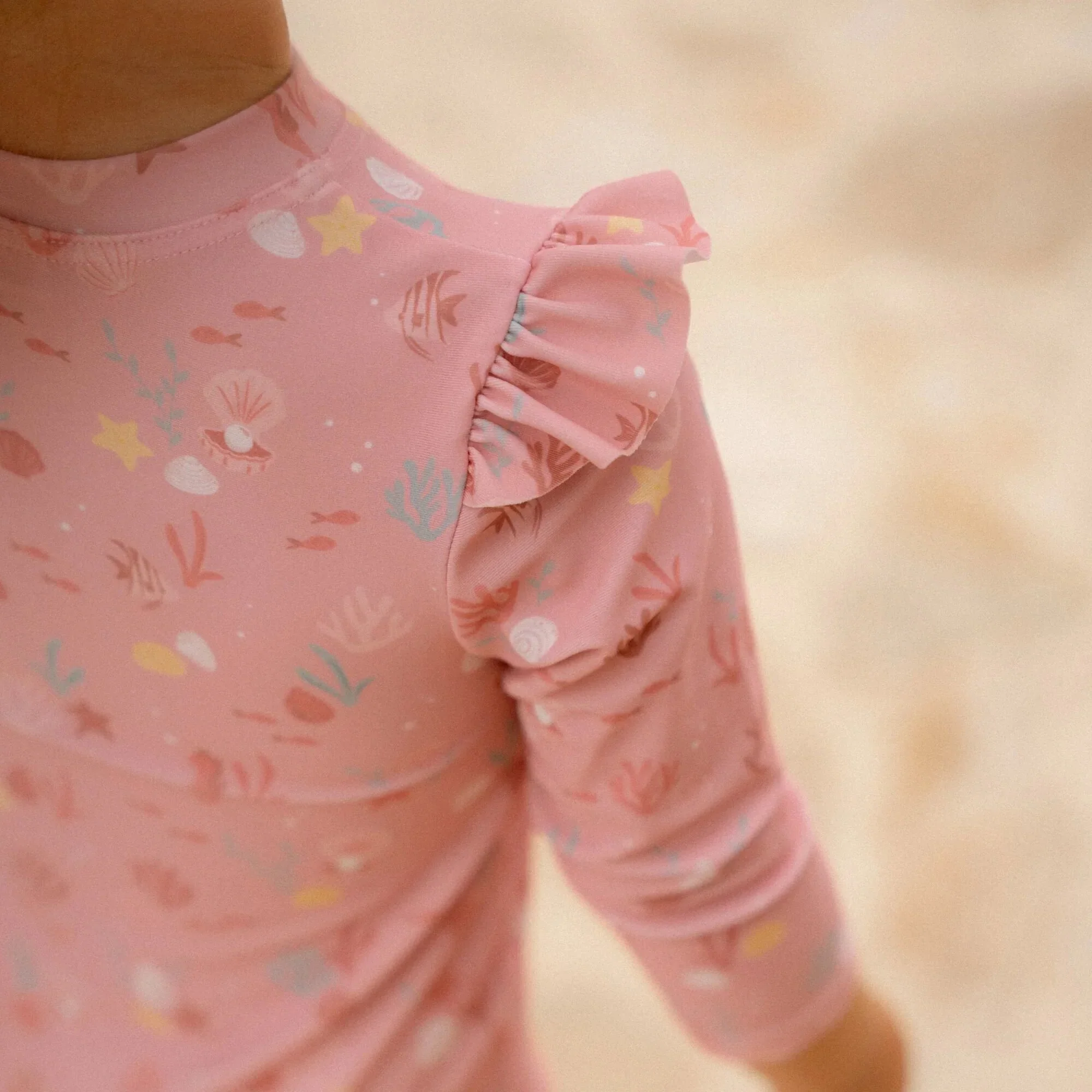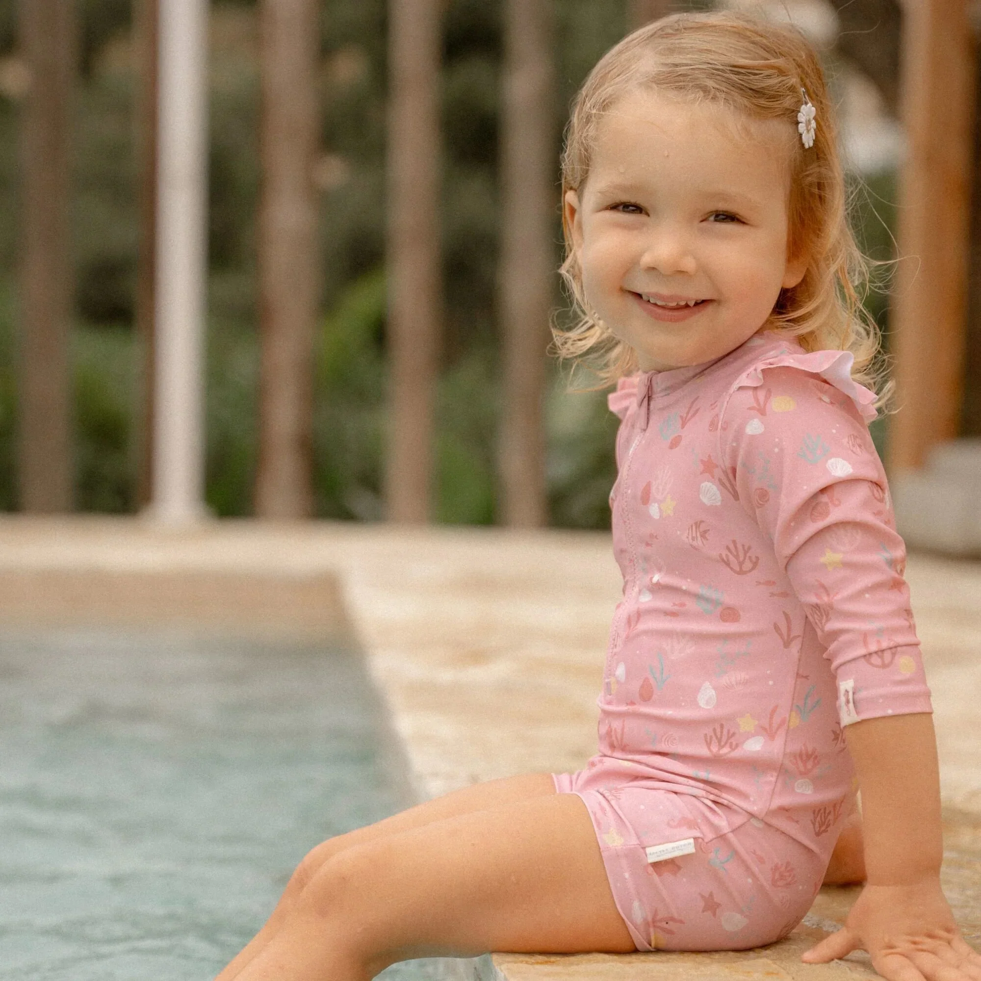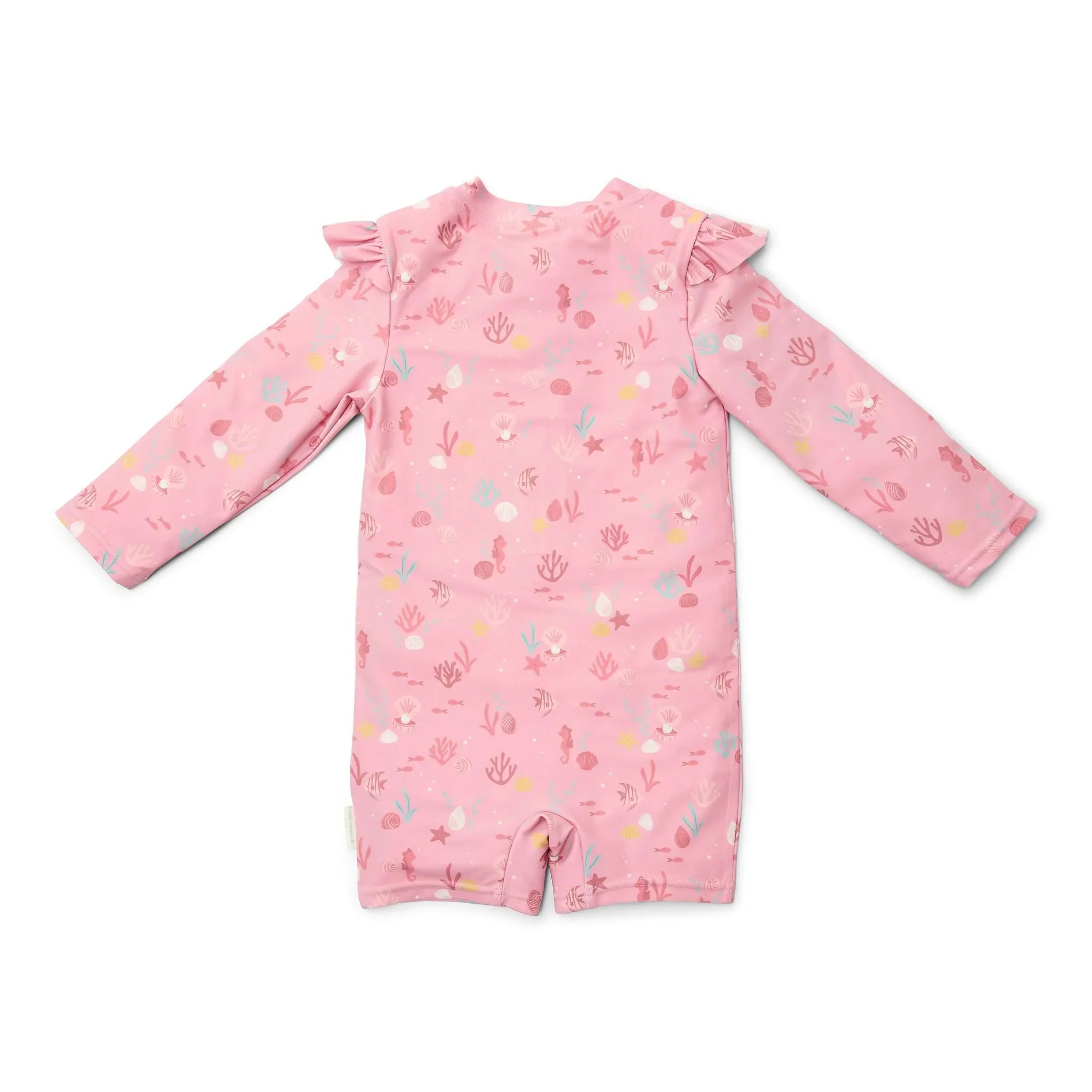 Duik de zomer in met dit schattige badpak met het betoverende Ocean Treasures-dessin. De lichtroze basis is rijkelijk versierd met zeepaardjes, koraal en schelpen, wat zorgt voor een sprookjesachtig onderwaterthema. De lange mouwen bieden extra bescherming tegen de zon, terwijl de ruches op de schouders een speelse en elegante touch toevoegen. De ritssluiting aan de voorkant maakt het aan- en uittrekken eenvoudig, ook wanneer je kindje nat en zanderig is.