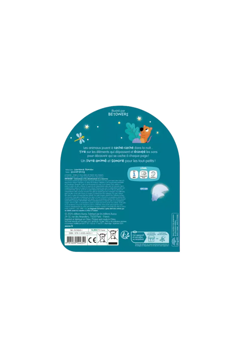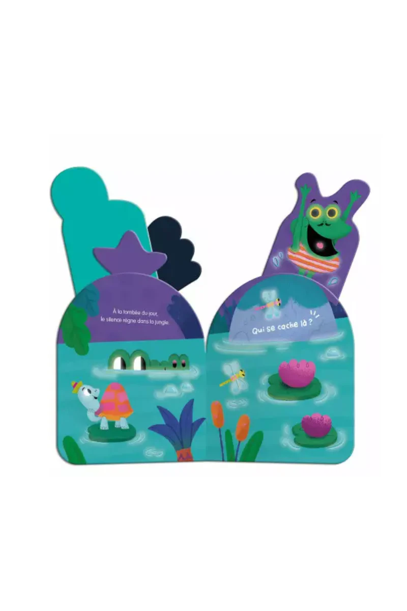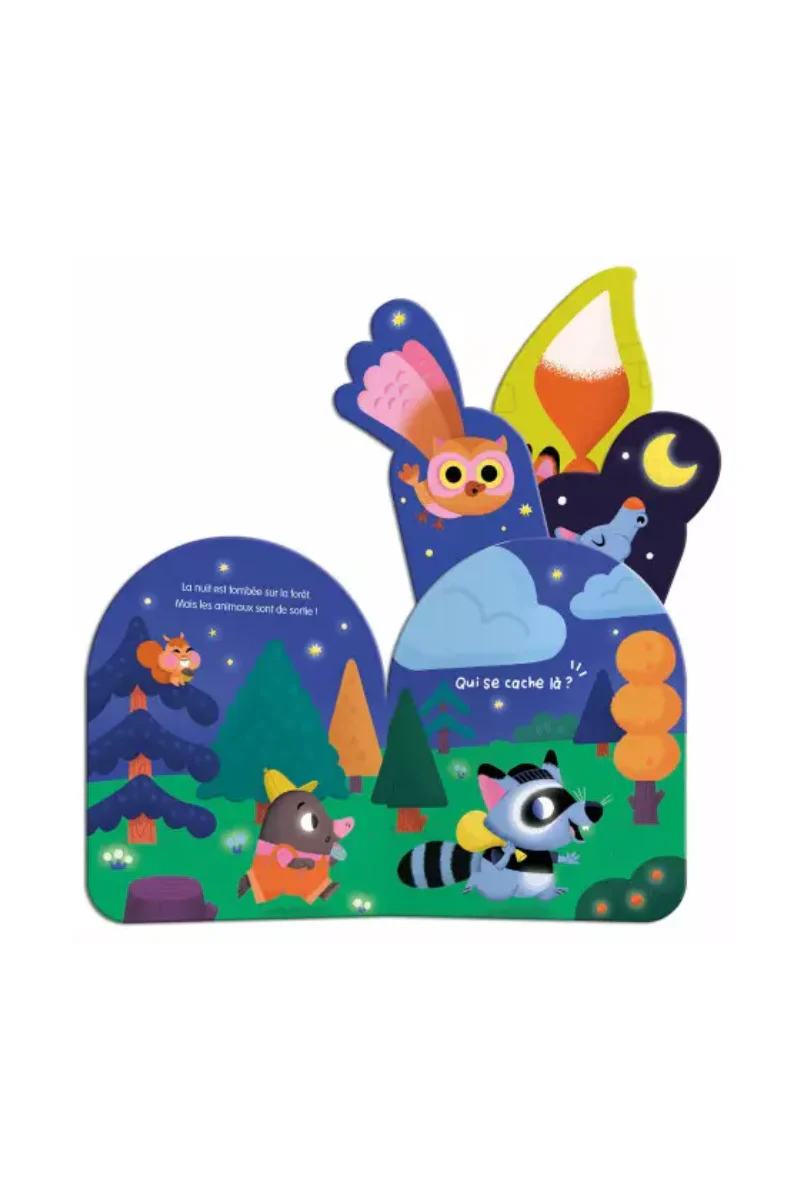 Dans l’obscurité, les animaux jouent à cache-cache… Tire sur les éléments qui dépassent et découvre qui se cache derrière chaque cri ! Un livre sonore et phosphorescent pour une lecture magique dans le noir.