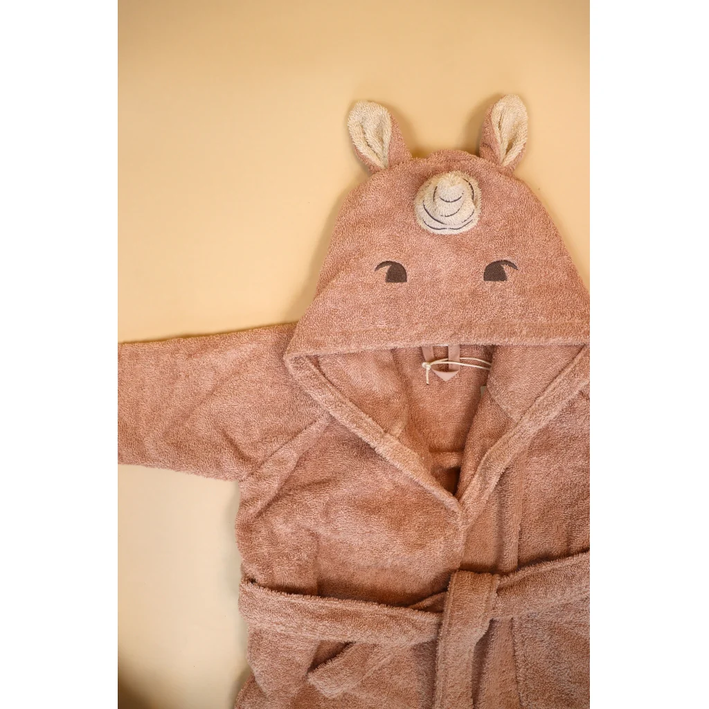 Kinderbadjas van biologisch katoen. Zachte Achaia-badjas die uw kind warm en droog houdt. De badjas is gemaakt van 100% biologisch katoenen badstof en heeft een geborduurd dierengezichtje en schattige oortjes op de capuchon.