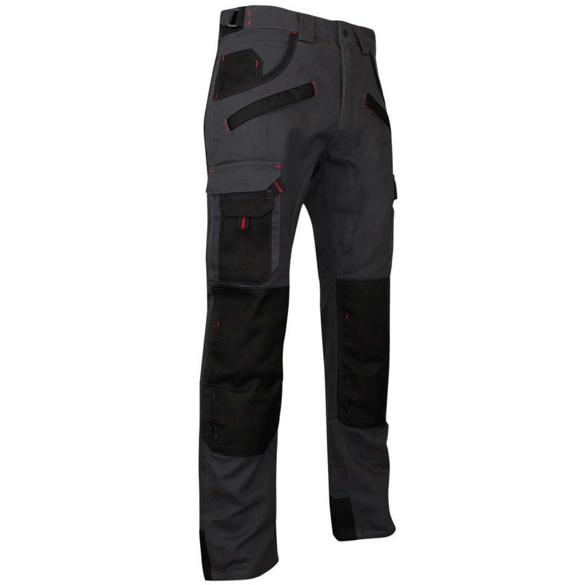 Pantalon de travail bicolore très résistant. Ceinture resserrable par pattes élastiquées. 2 poches western avec 1 poche ticket. Poches genouillères double position. Multipoches. 1 poche mètre et 1 poche à stylo. Ceinture rehaussée dos. Renfort bas de jambe. Renfort entrejambe devant et dos. Triples piqûres.