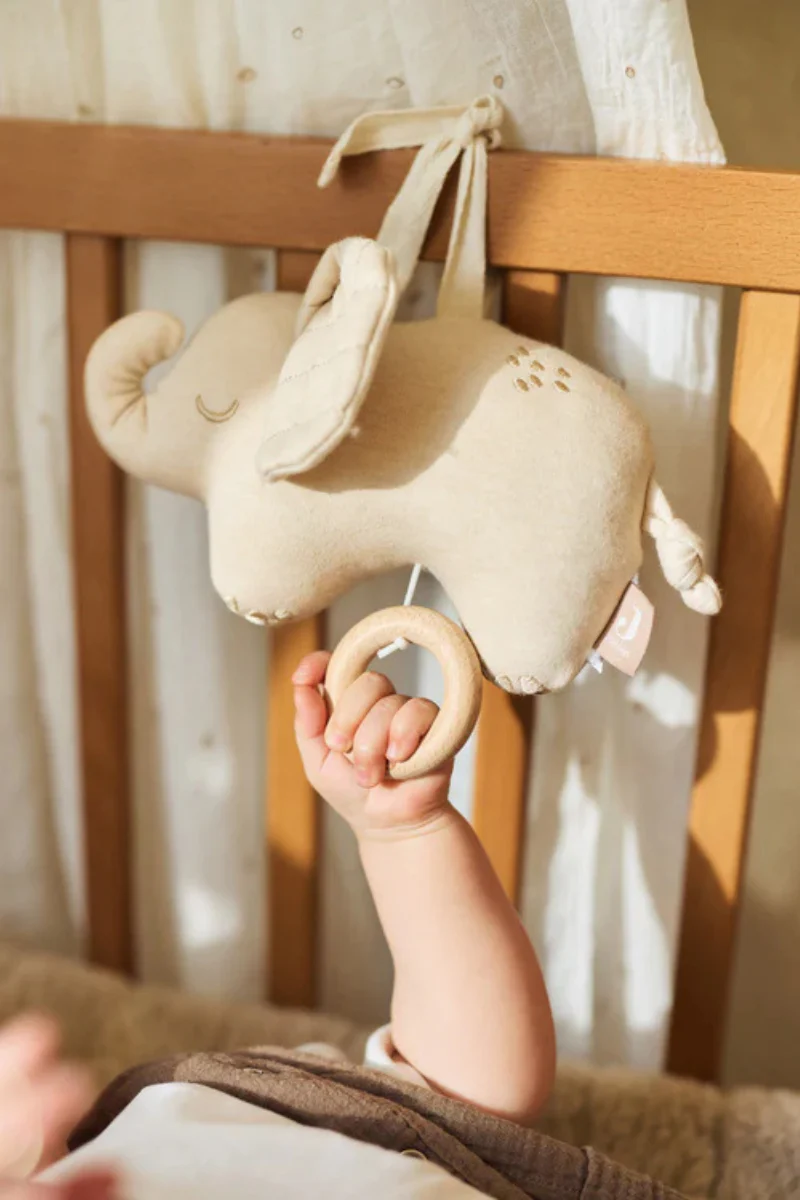Ce joli petit éléphant coloris crème chantera pour votre enfant ! Lorsque vous tirez sur l’anneau en bois, cette jolie peluche joue une petite musique douce. Votre bébé s’en trouvera apaisé.