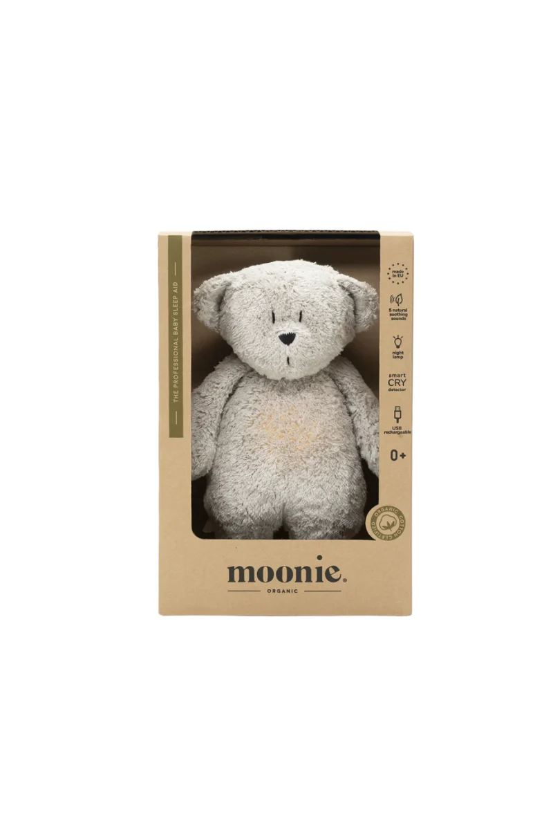 L’ourson Moonie accompagne bébé avec douceur dès la naissance grâce aux bruits blancs, pour des nuits pleines de sérénité. Fabriqué à partir de coton biologique tout doux, il est conçu pour offrir une expérience d’endormissement rassurante et complète. À l’intérieur se cache un module sonore et lumineux pensé pour répondre aux besoins des tout-petits.