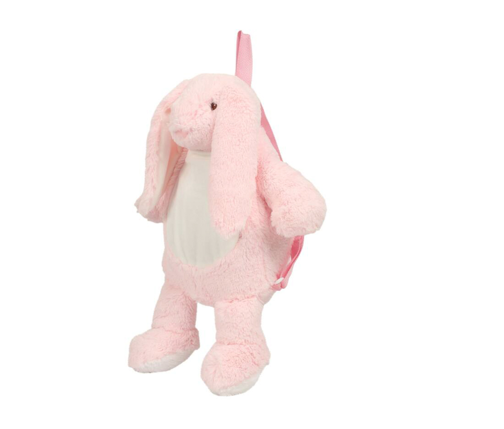 Sac à dos lapin. Sac à dos en peluche lapin. Accès zippé à l’arrière. Bretelles et poignée en nylon. Conforme à la norme Européenne pour les jouets EN71. Surface d’impression : 15,5x20cm. 100% polyester.