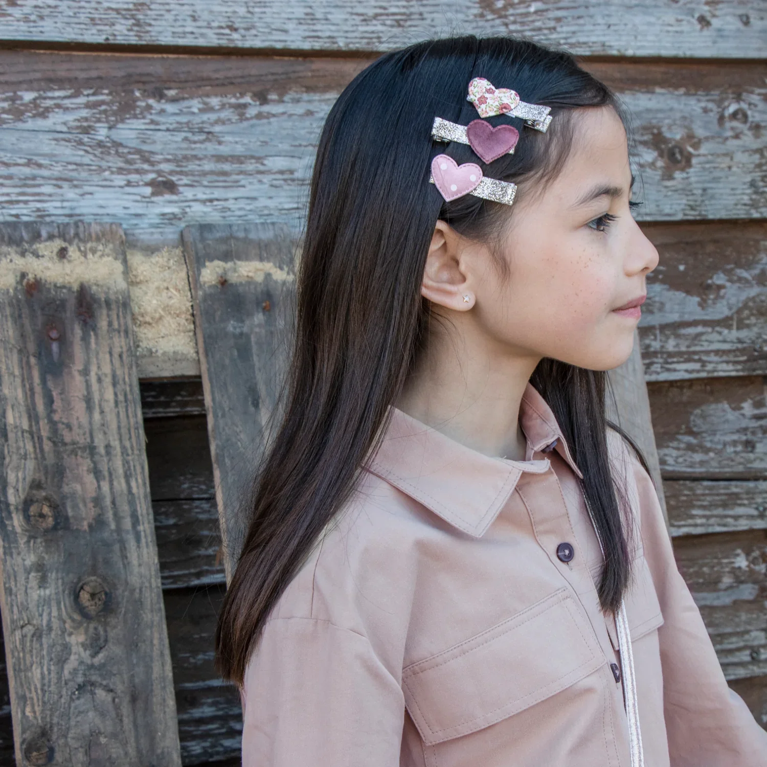 Deze set van drie haarspeldjes is een ware blikvanger in het haar van jouw kindje. De set bevat drie verschillende soorten hartjes: een hartje met een bloemenmotief, een hartje met zacht bruin stof en een hartje met een roze polkadot patroon. De clips zijn verfraaid met glinsterend goudkleurig materiaal.