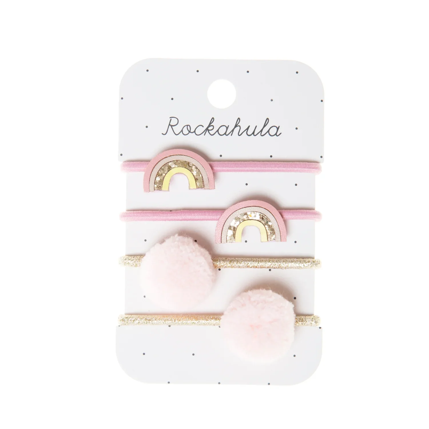 Breng wat vrolijkheid op een regenachtige dag met de set van vier haarelastiekjes ‘Magical Rainbow Ponies’ van het Engelse merk Rockahula Kids. Deze set bevat twee kinderhaarelastiekjes versierd met glinsterende regenbogen en regenboogjes, en twee met pom-pomaccenten.