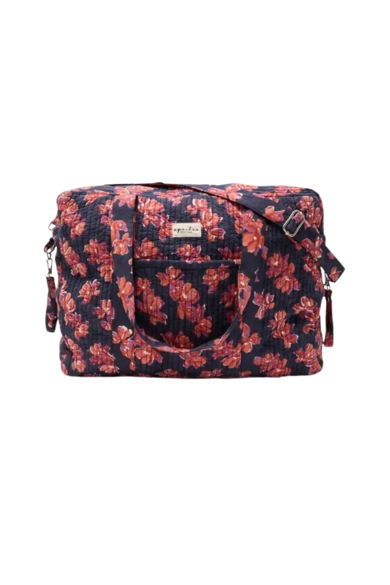 Découvrez le tout nouveau sac à langer Thaila Violeta Navy en coton imprimé matelassé. Il combine élégance et fonctionnalité et dispose de poches astucieuses et d’un mousqueton pratique.