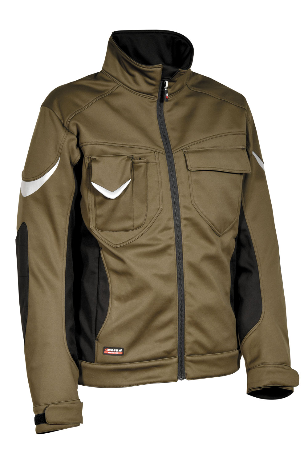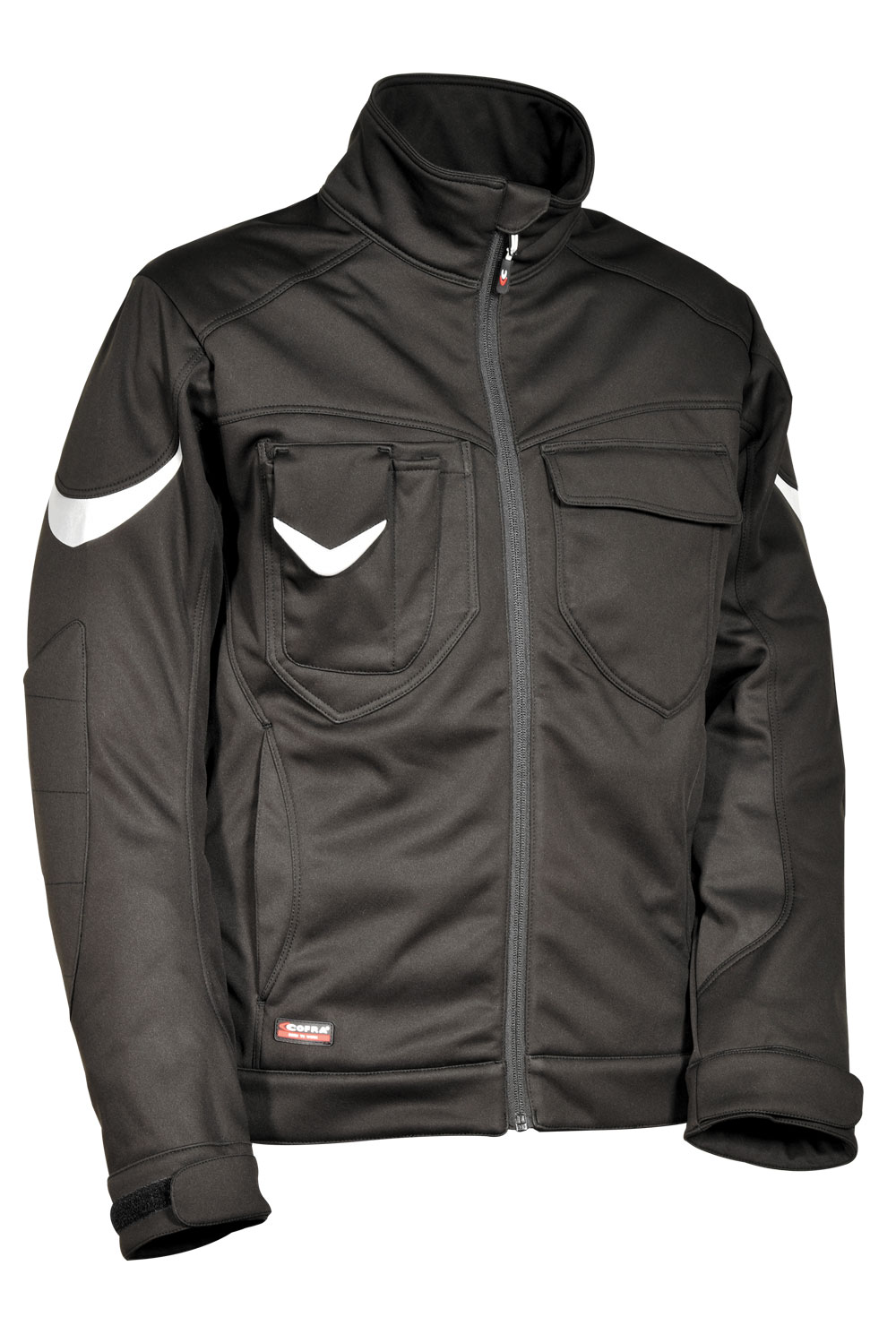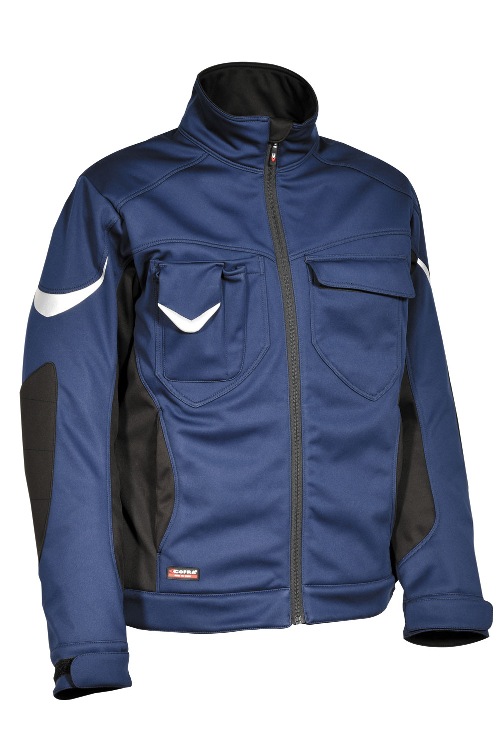 2 poches dans le bas avec zip. 2 poches poitrine avec velcro. Insert à stylos. Inserts réfléchissants. Manches à coupe ergonomique. Passant porte-badge. Poche pour téléphone mobile en tissu E-WARD. Poignets ajustables. Rabat de protection au niveau du menton. Tissu élastique. Veste SOFTSHELL avec couche polaire à l’intérieur. SOFTSHELL 100% polyester + membrane COFRA-TEX + polaire 100% polyester.