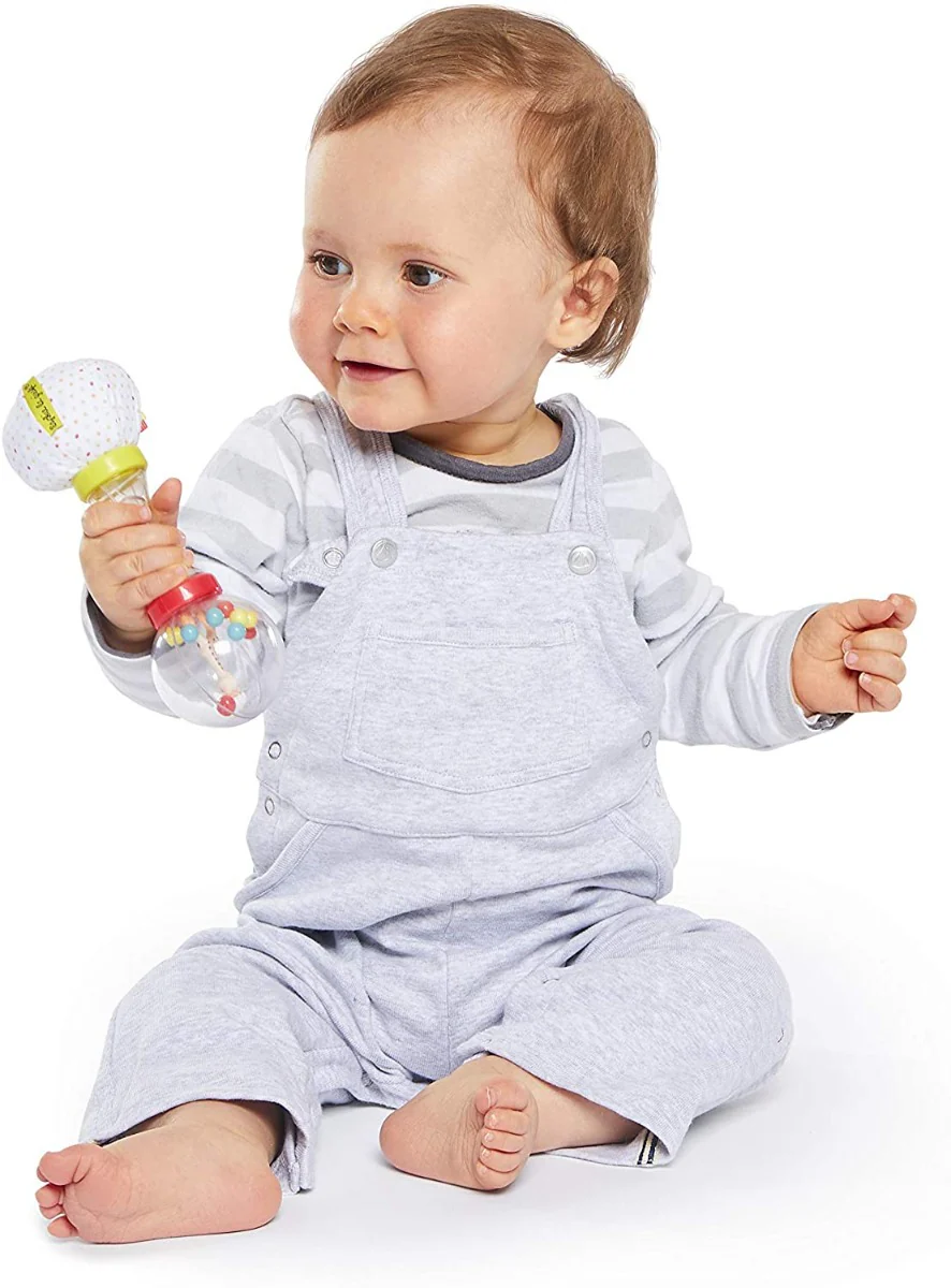 Door de ergonomische vorm van het handvat is het makkelijk om de rammelaar vast te pakken en ermee te schudden. Als de baby de rammelaar schudt, hoort en ziet hij gekleurde balletjes die tegen elkaar botsen. De onderkant van de rammelaar is gemaakt van knisperstof en bevat labels om aan te raken.