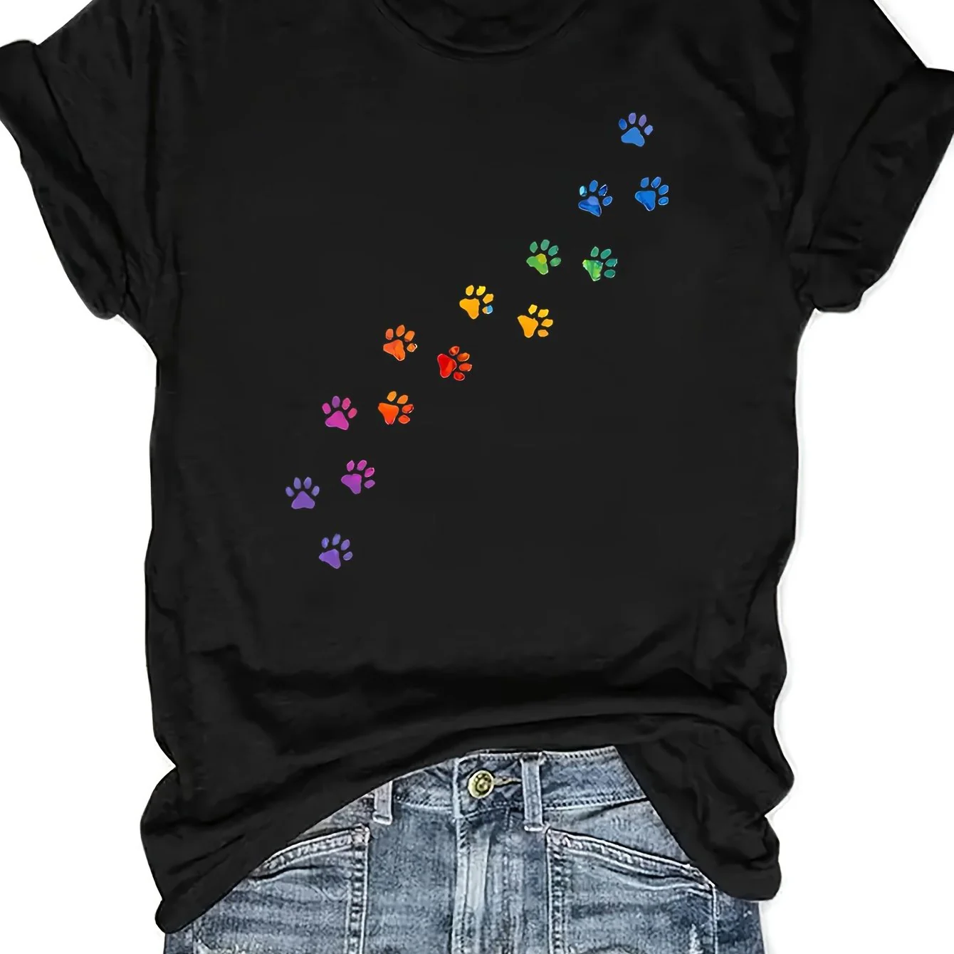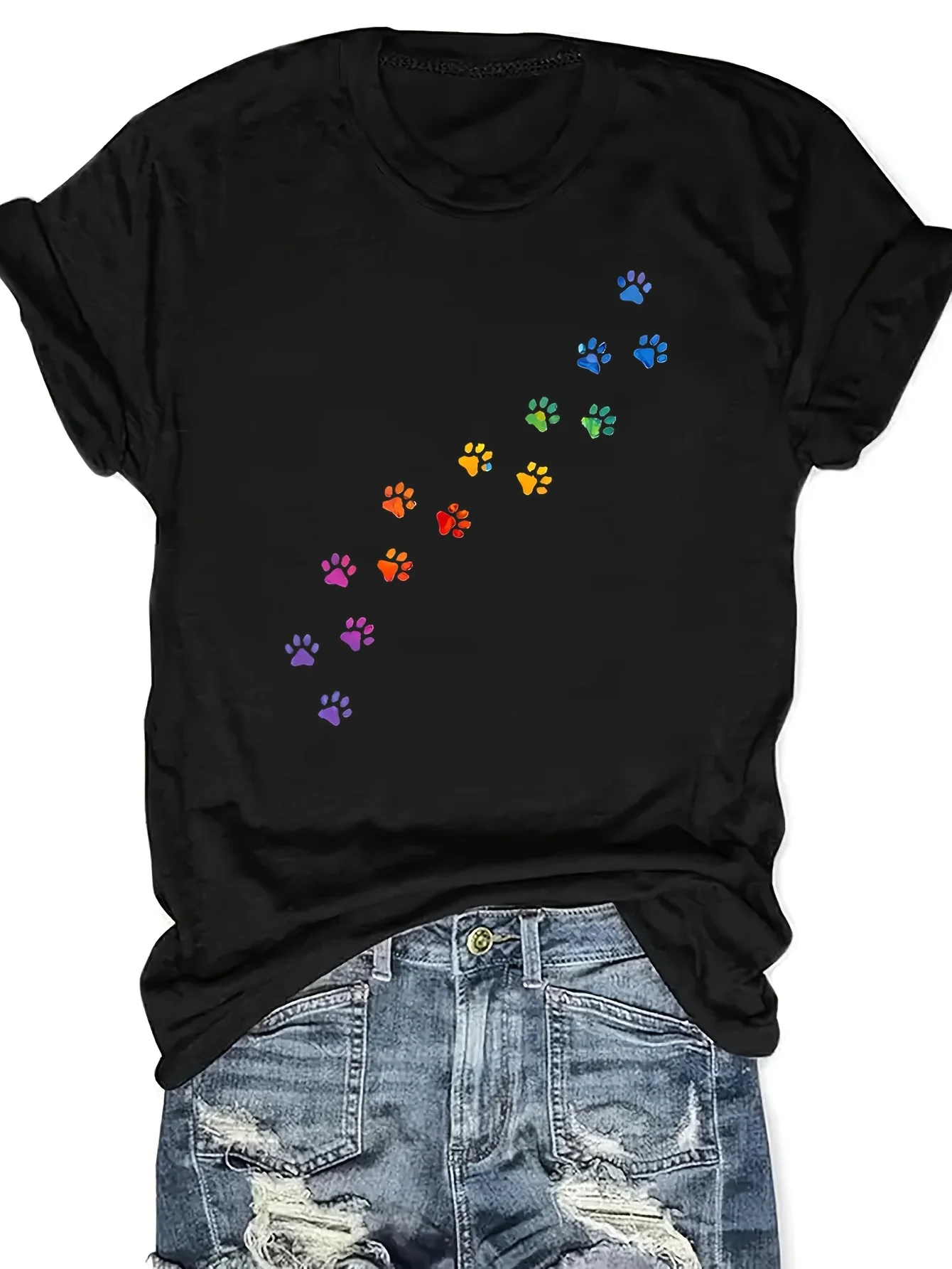 T-shirt ras du cou imprimé pattes colorées, décontracté