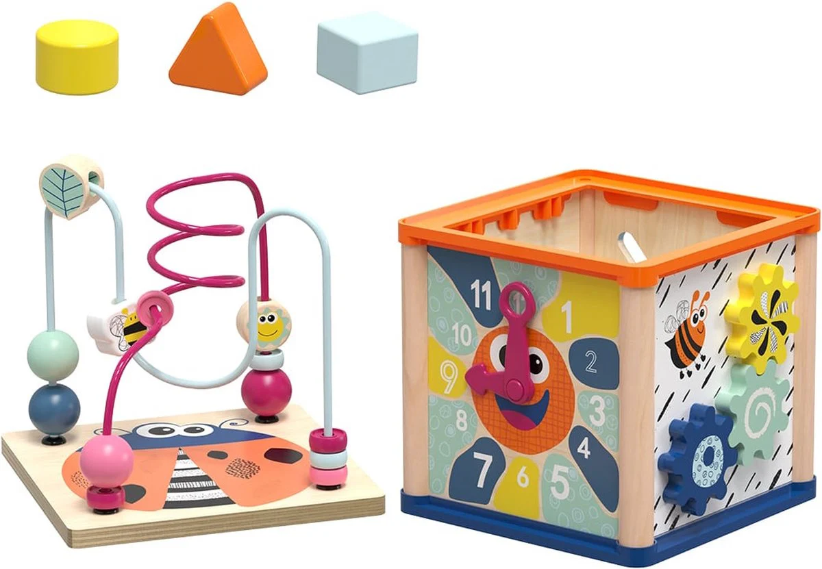 De activiteitenkubus bestaat uit vijf zijdes vol speelplezier, elk met een uniek element zoals een klok met bewegende wijzers, tandwieltjes, een vormenstoof en een schattig vlindertje. Aan de bovenkant bevindt zich een uitneembaar kralenlabyrint, dat apart gebruikt kan worden. Alle blokken van de vormenstoof kunnen handig binnenin de kubus worden opgeborgen.