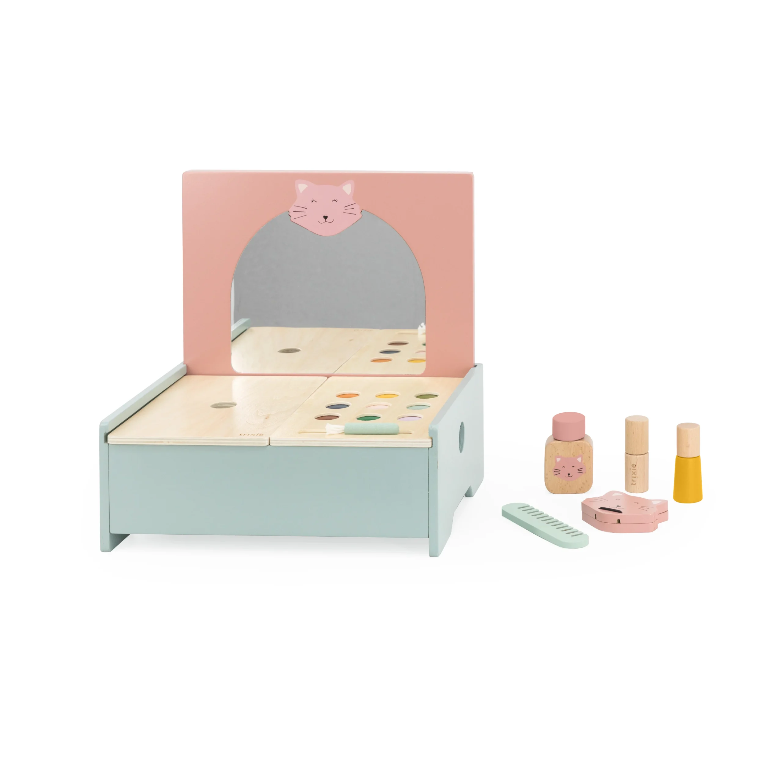 Klaar voor het feestje? Tijd om ons mooi te maken! Kleintjes vinden het leuk om grote mensen na te doen, dus deze houten meeneem kaptafel met mooie kleuren en een glanzende spiegel wordt een schot in de roos. De set heeft een kam, parfumflesje, lippenstift, blush met make-up borstel, spiegeltje en nagellak die allemaal perfect in de doos passen.