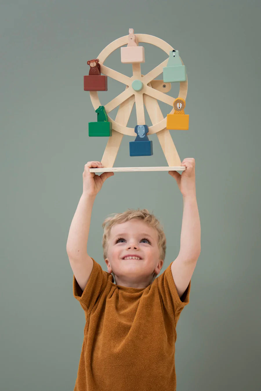 Draaien maar! Al onze dierenvrienden genieten van een ritje in het reuzenrad. Kinderen kunnen het wiel doen draaien door middel van de hendel aan de achterkant. Geef elk dier een plaatsje in het rad en laat de pret beginnen! Het reuzenrad en de dieren zijn gemaakt van 100% FSC © gecertificeerd hout. Alle verven zijn op waterbasis en veilig voor baby’s.
