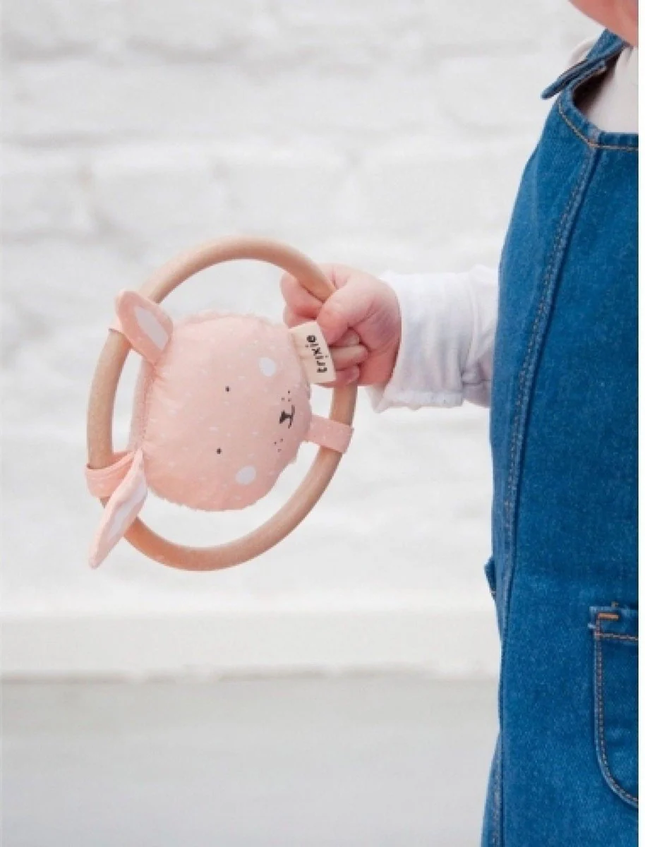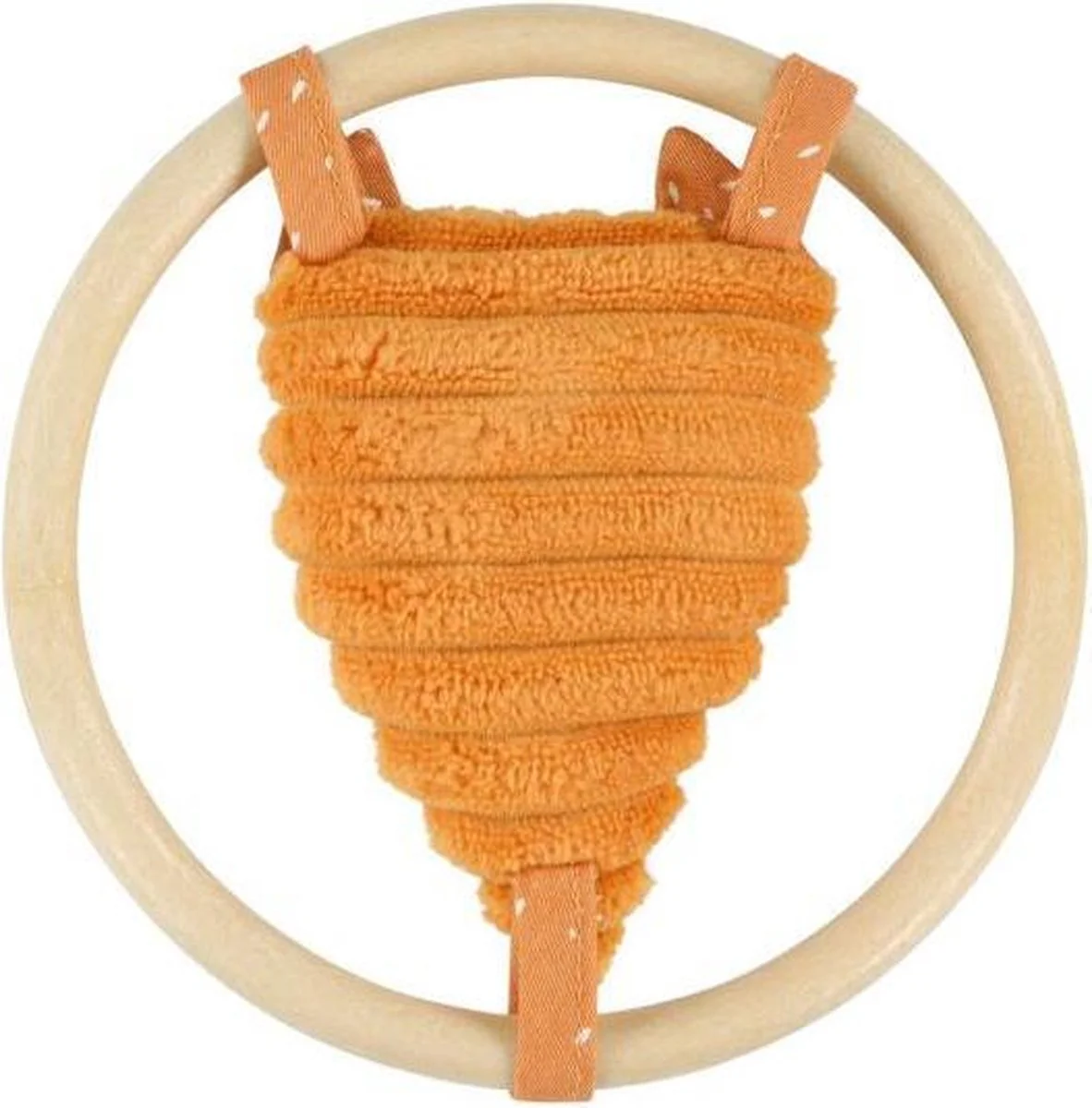 Zelfs de kleinste vingertjes kunnen deze schattige, kleine rammelaar vastpakken. Het rammelaartje en het knispaper papier zorgen voor uren entertainment voor elke baby! Kenmerken Materialen: ring: ABS – hoofdje: cotton twill + corduroy Afmetingen ring: diameter 13cm – hoofdje: ± diameter 8,5cm