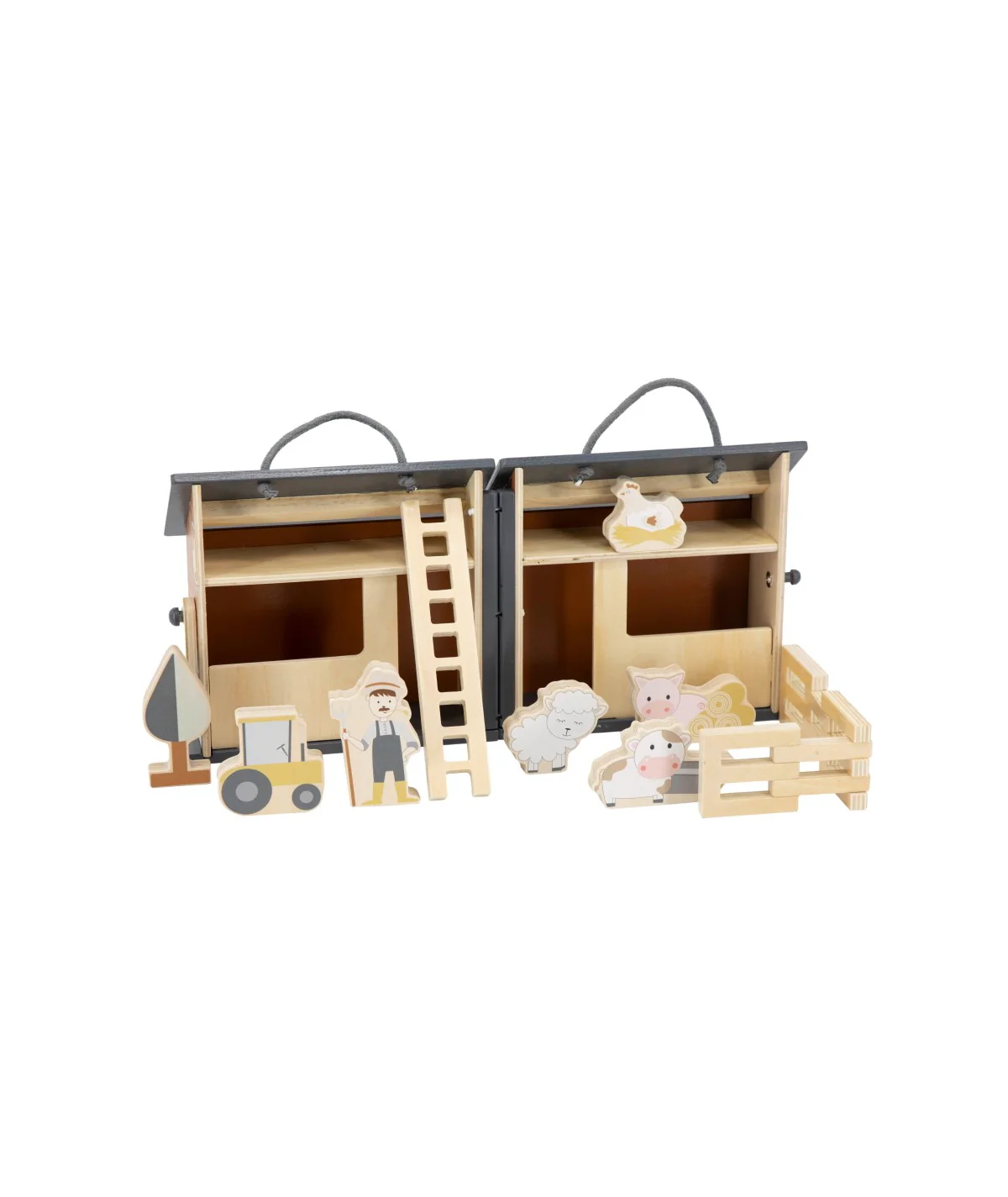 Deze houten boerderij van Tryco is ideaal om mee te nemen naar opa en opa bijvoorbeeld! Je kan hem gemakkelijk inklappen en meenemen aan het touwtje. De set bestaat uit verschillende boerderijdiertjes, een boer, hekje en zelfs een laddertje!