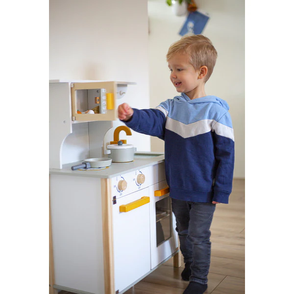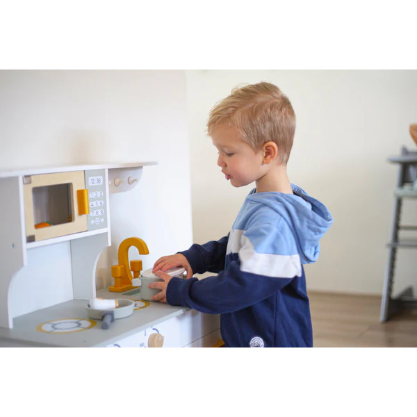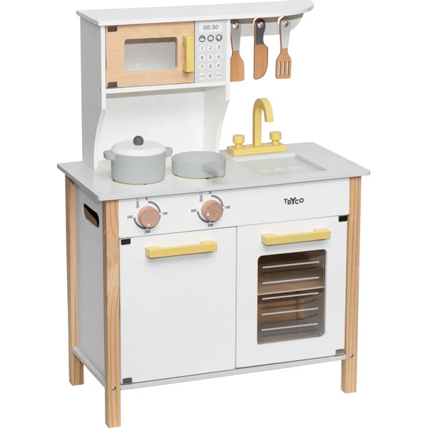 Je kleine wordt een echt keukenprins(es)je met dit leuke houten keukentje van Tryco! Het keukentje is wit van kleur met gouden details, het zal een echte eye-catcher zijn voor in de speel/woon-kamer.