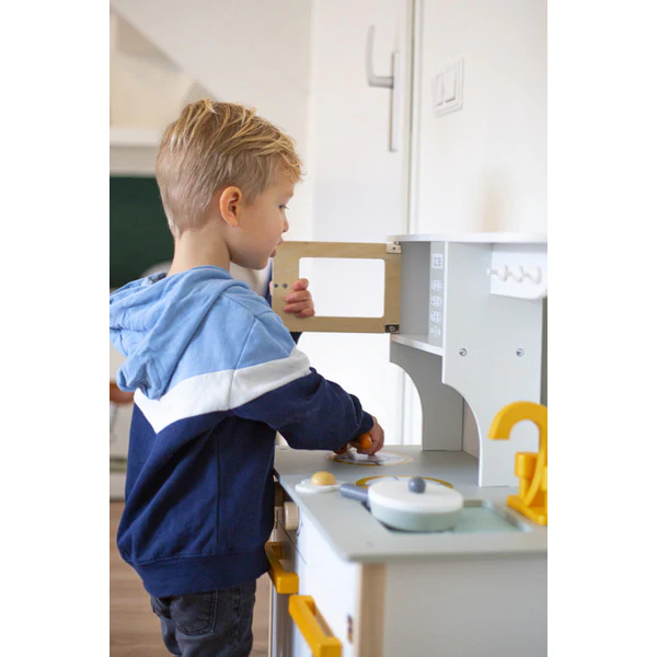 Het keukentje wordt geleverd met twee pannetjes, 2 spatels en een mes. Dus je kindje kan zich helemaal uitleven. Het deurtje kan geopend worden voor extra opbergruimte en aan de knopjes van het fornuis kan gedraaid worden. In de magnetron warmt je kindje gemakkelijk eten op. Het lijkt net echt! Geschikt vanaf 3 jaar.