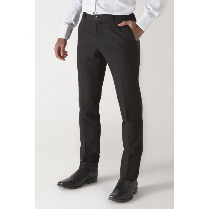Pantalon fitté Ceinture avec passants Fermeture à glissière centrale Bouton cousu + agrafe 2 poches italiennes Pinces devant et dos 2 poches dos Bas de jambes sans ourlets